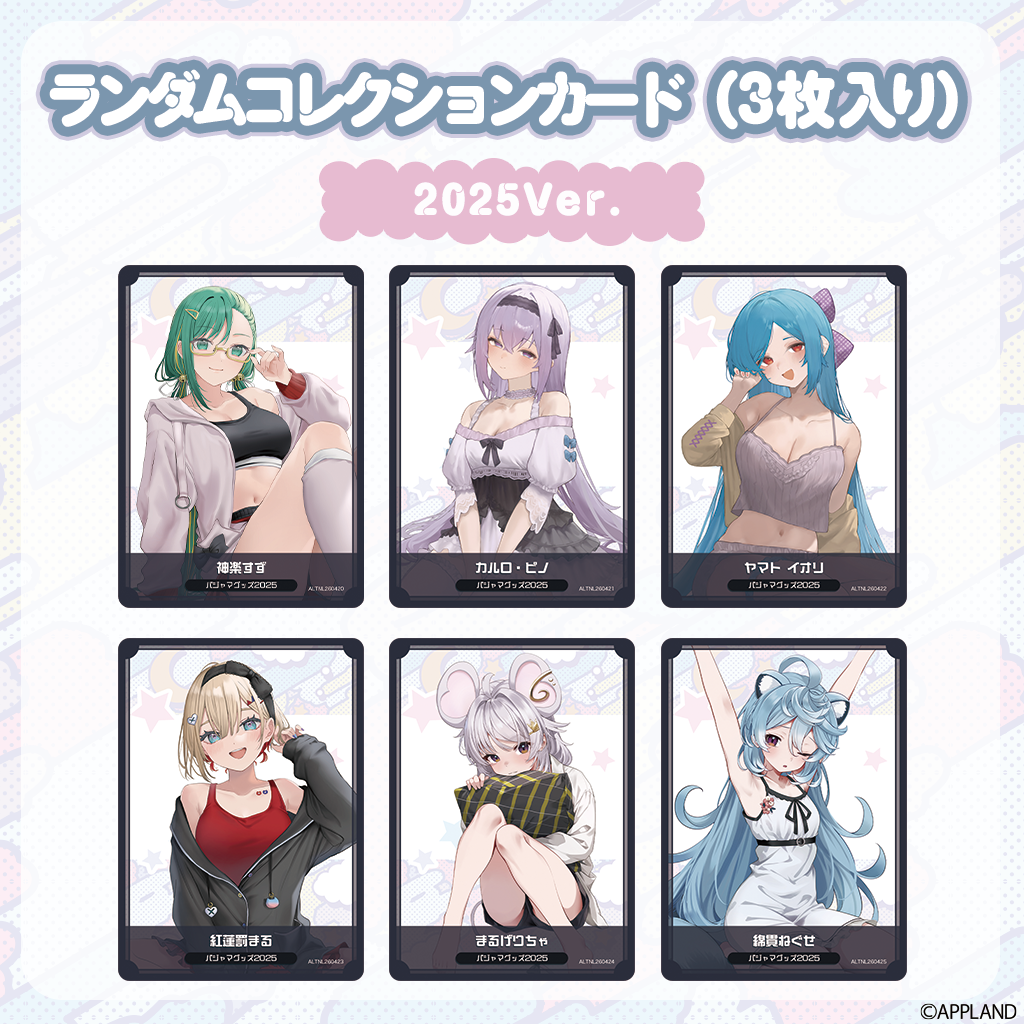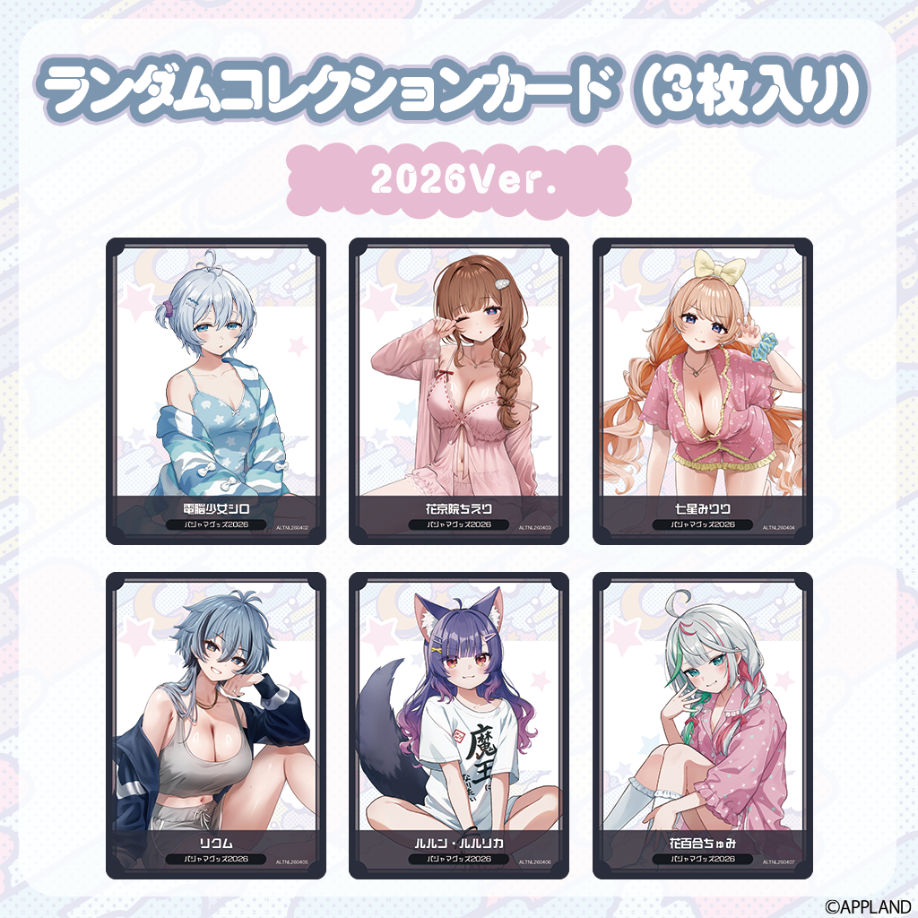 「.LIVE」より電脳少女シロ、花京院ちえり、七星みりり、リクム、ルルン・ルルリカ、「ぶいぱい」より花百合ちゅみの描き下ろしイラストを使用したアイテムが登場!さらに『パジャマグッズ2025』メンバーのイラストを使用したランダムコレクションカードなどもあわせて販売いたします。