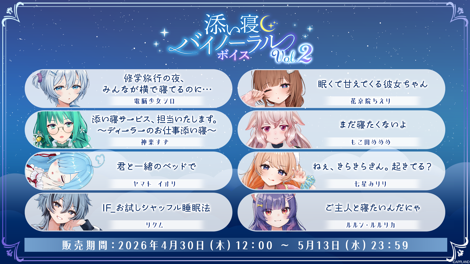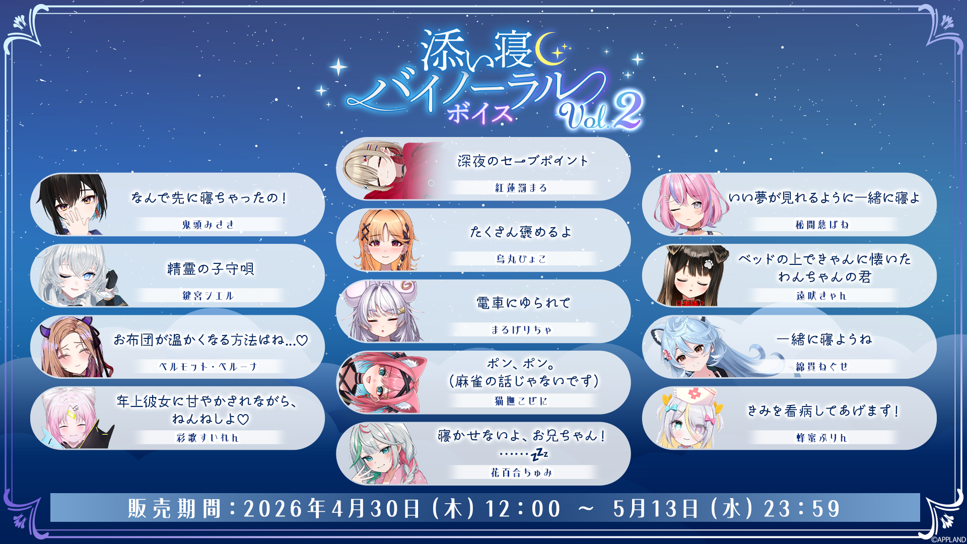 また、”添い寝”をテーマに.LIVEとぶいぱいメンバーが考案した『添い寝バイノーラルボイス』のVol.2が登場!大好評だったVol.1も同時に再販売いたします。