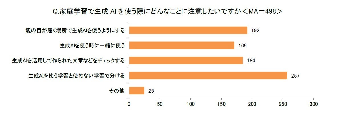 「家庭学習でも生成 AIを使いたいと思いますか<SA>」の問では、8 割近くが「はい」(385)と回答し、日常から 生成 AIの活用に意欲的であることがわかります。また、「家庭学習で生成 AI を使う際にどんなことに注意したい ですか<MA>」と聞いたところ、半数以上が「生成 AIを使う学習と使わない学習で分ける」(257)を選択し、次いで 「親の目が届く場所で生成 AI を使うようにする」(192)となりました。子どもの頃から、生成 AIを積極的に学習に取り入れていきたいと感じるからこそ、ルールを定め、親の目が届く場所で使ってほしいという思いが見て取れます。