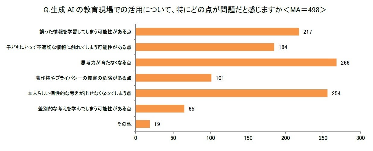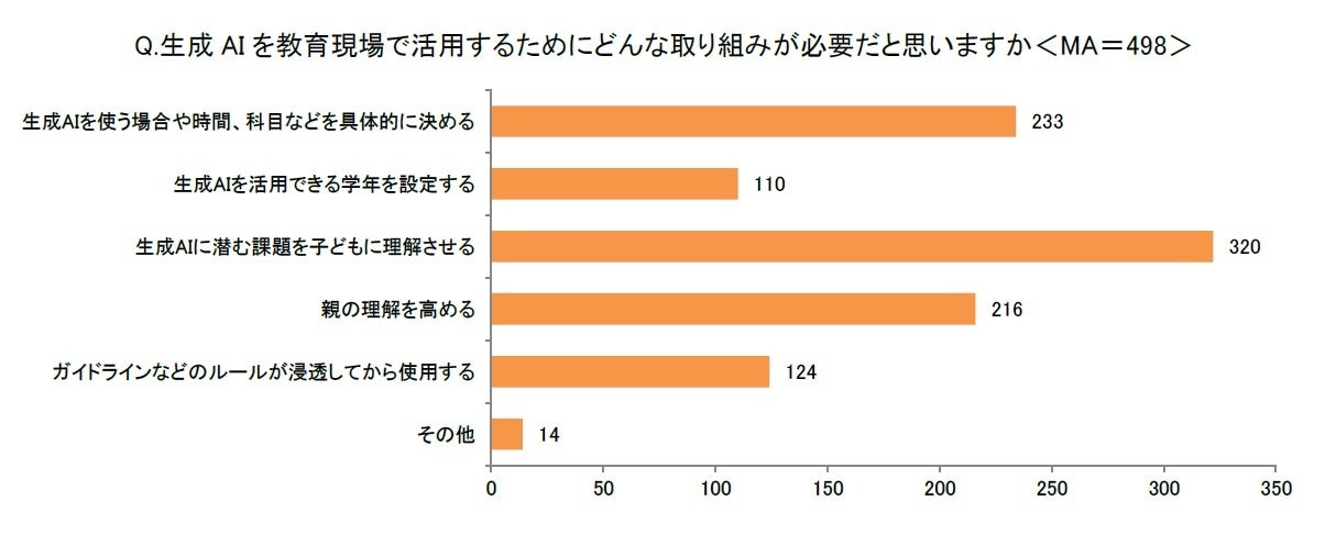 その一方で、「生成 AI の教育現場での活用について、いくつか問題視されている点もありますが、特にどの点 が問題だと感じますか<MA>」では、1 位が「思考力が育たなくなる点」(266)、2 位が「本人らしい個性的な考えが出せなくなってしまう点」(254)、3 位が「誤った情報を学習してしまう可能性がある点」(217)となりました。 また、「生成AIを教育現場で活用するためにどんな取り組みが必要だと思いますか。<MA>」の問について、 最も回答が多く集まったのは「生成 AI に潜む課題を子どもに理解させる」(320)となりました。次いで、「生成 AI を 使う場合や時間、科目などを具体的に決める」(233)、「親の理解を高める」(216)と続き、決まりを作った活用と、教育者や親のリテラシー向上が必要だと感じていることがわかりました。