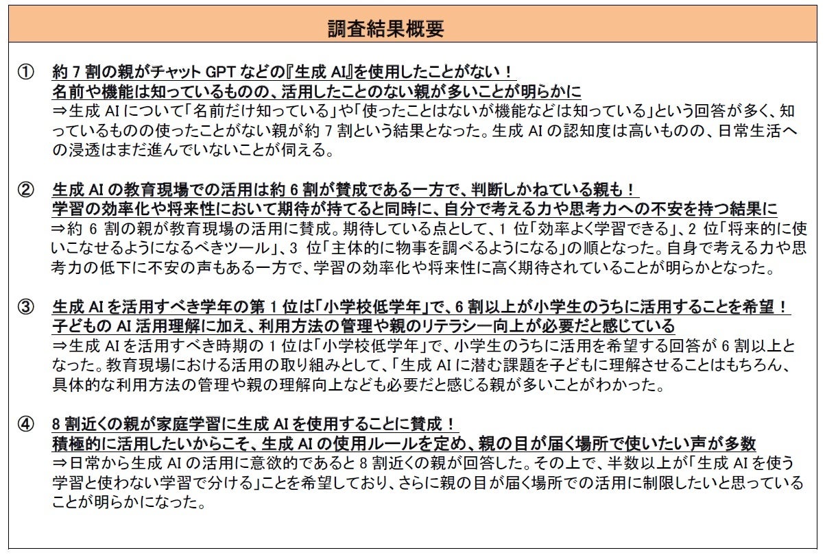 調査の結果、親自身のリテラシー不足に懸念はあるものの、将来を見据えた学習効率化への期待が集まり、生成AI活用への注目度が高いことがわかりました。