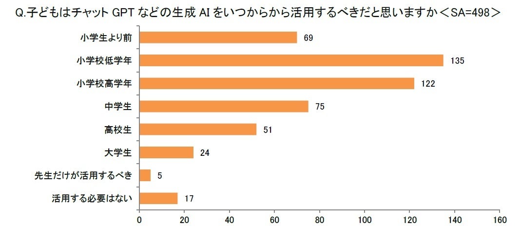 「子どもはチャットGPTなどの生成 AI をいつからから活用するべきだと思いますか<SA>」の問では、「小学校低学年」(135)と「小学校高学年」(122)に回答が多く集まりました。「小学生より前」(69)も加えると、6 割以上が小学生のうちに活用するべきだと考えていることが伺えます。