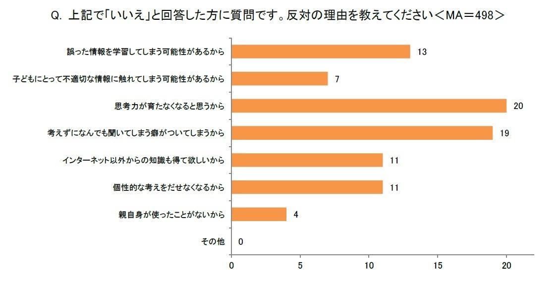 また、賛成と回答した方に「特にどんな点に期待しますか<MA>」と聞いたところ、1 位が「効率よく学習できる 点」(197)、2 位が「将来的に使いこなせるようになるべきツールである点」(195)、3 位が「主体的に物事を調べるようになる点」(162)となりました。現在の学習に役立てるだけでなく、将来的に生成 AI がより身近な存在になると考え、早い段階から慣れ親しむことを望んでいる親が多いことがわかります。 その一方で、「いいえ」と回答した方に、「反対の理由を教えてください<MA>」と聞いたところ、「思考力が育たなくなると思うから」(20)に続き、「考えずになんでも聞いてしまう癖がついてしまうから」(19)が多い結果となりました。 子どもが主体的かつ効率よく学習できる点には期待しつつも、自身で考え、情報の取捨選択する力に不安を感じ ていることが伺えます。