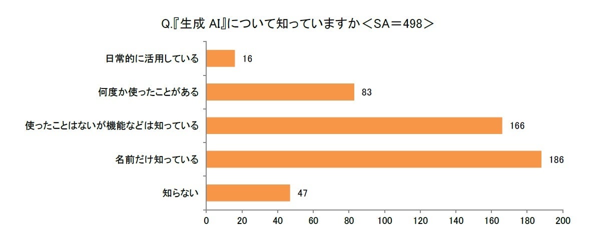 チャット GPT など『生成 AI』の教育現場での活用が進んでいる中で、「話題の『生成 AI』について知っていますか<SA>」の問について、「名前だけ知っている」(186)と「使ったことはないが機能などは知っている」(166)という回答が多く、知っているものの使ったことがない親が約 7 割となりました。この結果から、生成 AI の認知度は高いものの、日常生活への浸透はまだ進んでいないことがわかります。