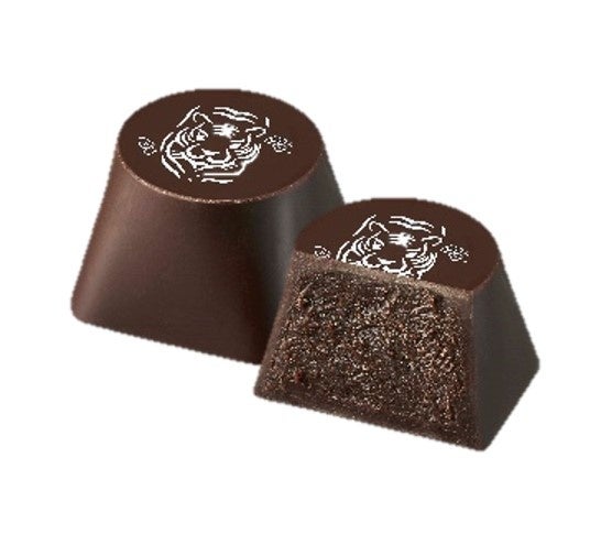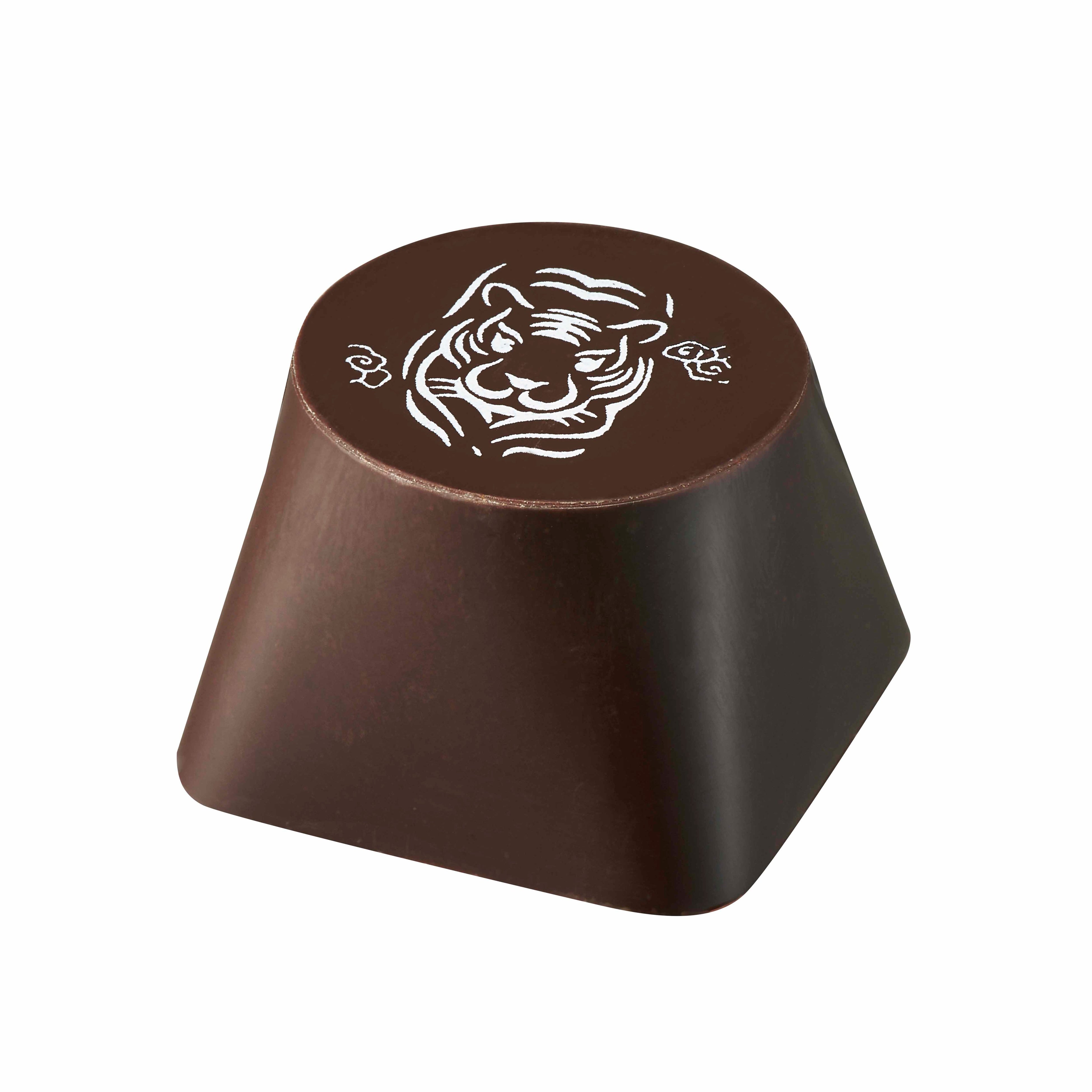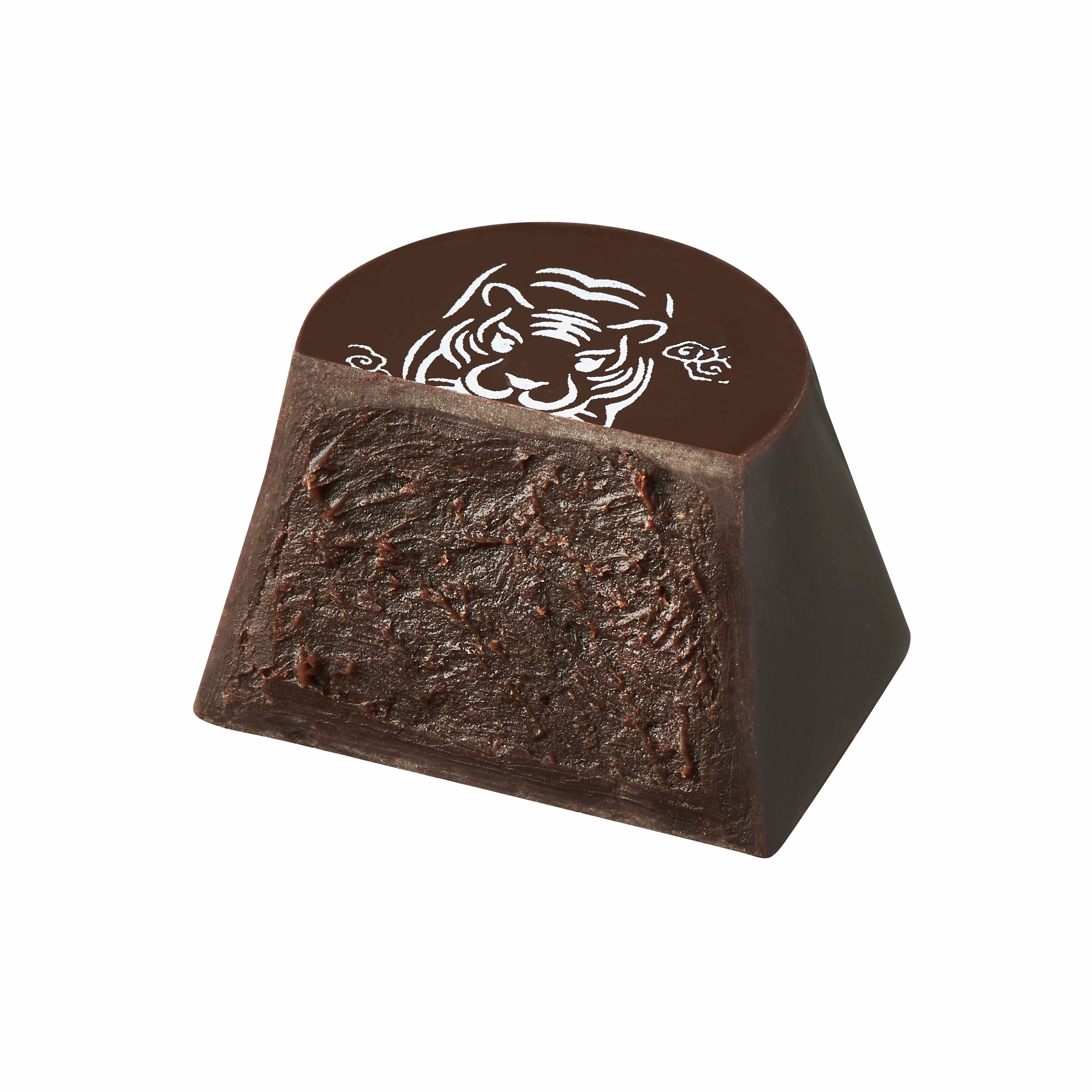 なめらかでコクのある85%ダークチョコレートガナッシュを、ダークチョコレートで包み、2022年の干支「寅」のモチーフで飾りました。