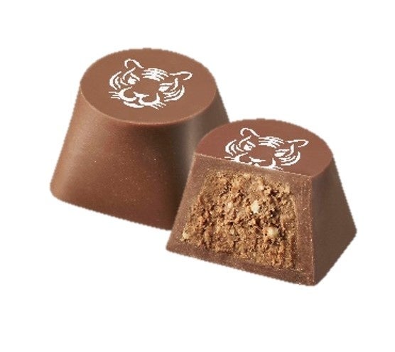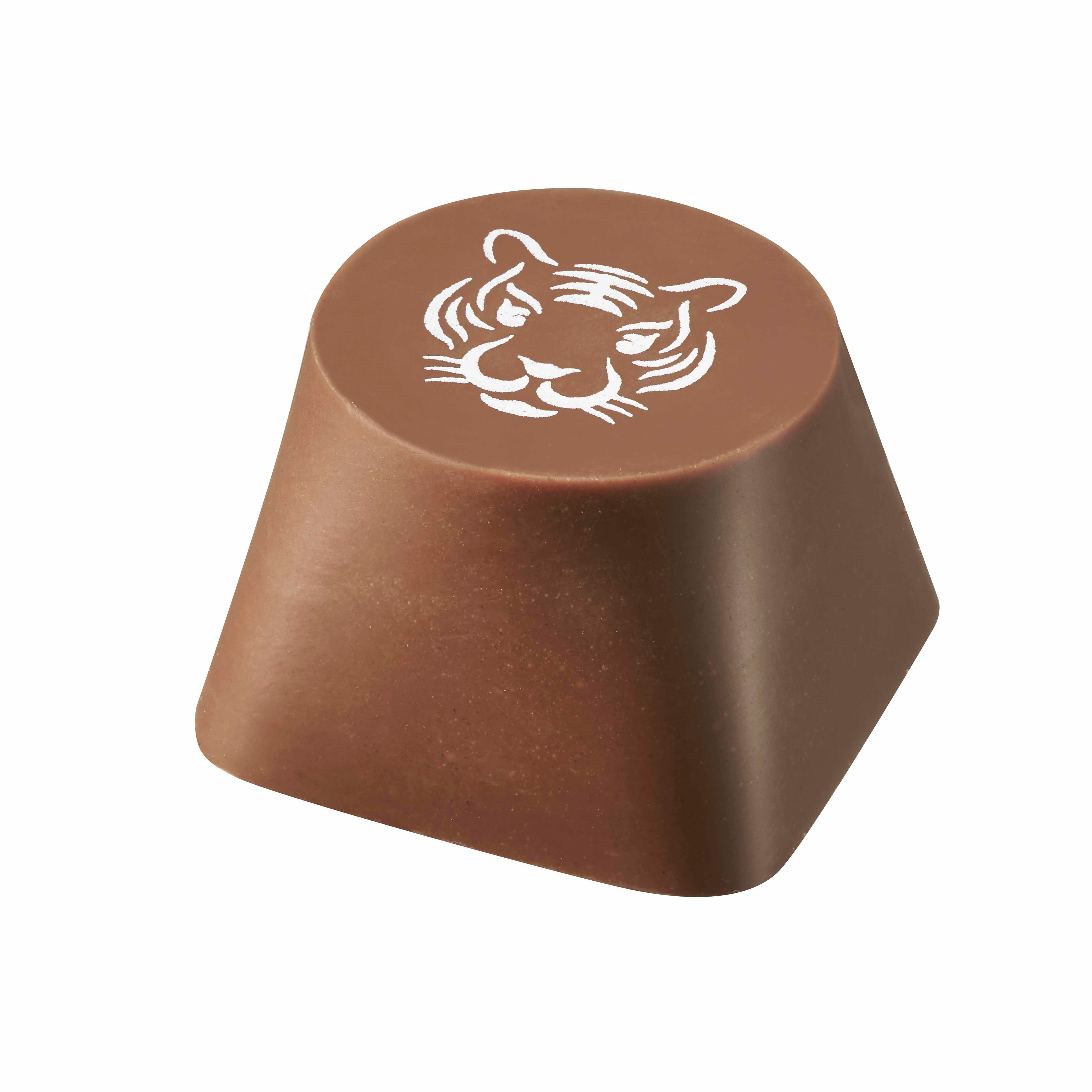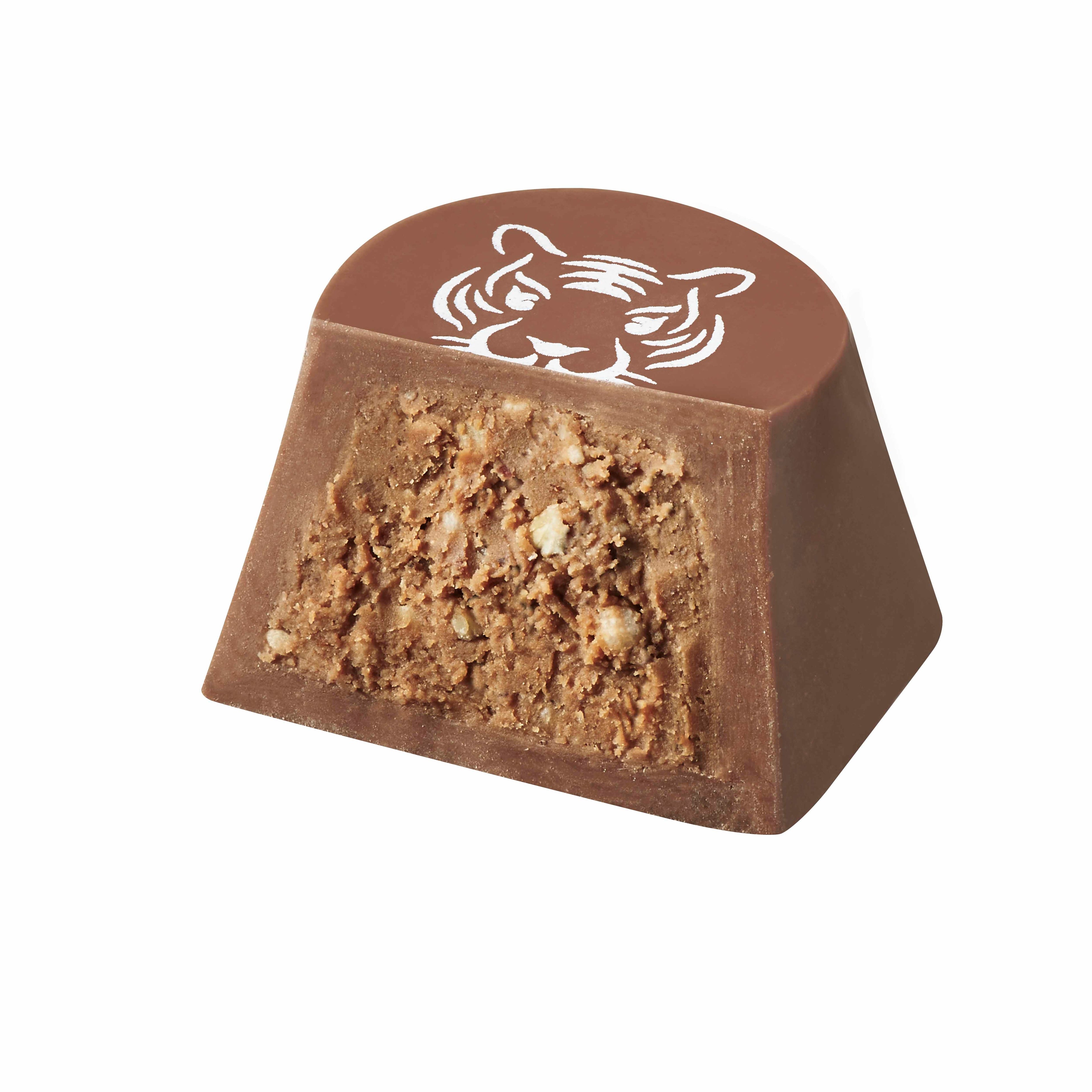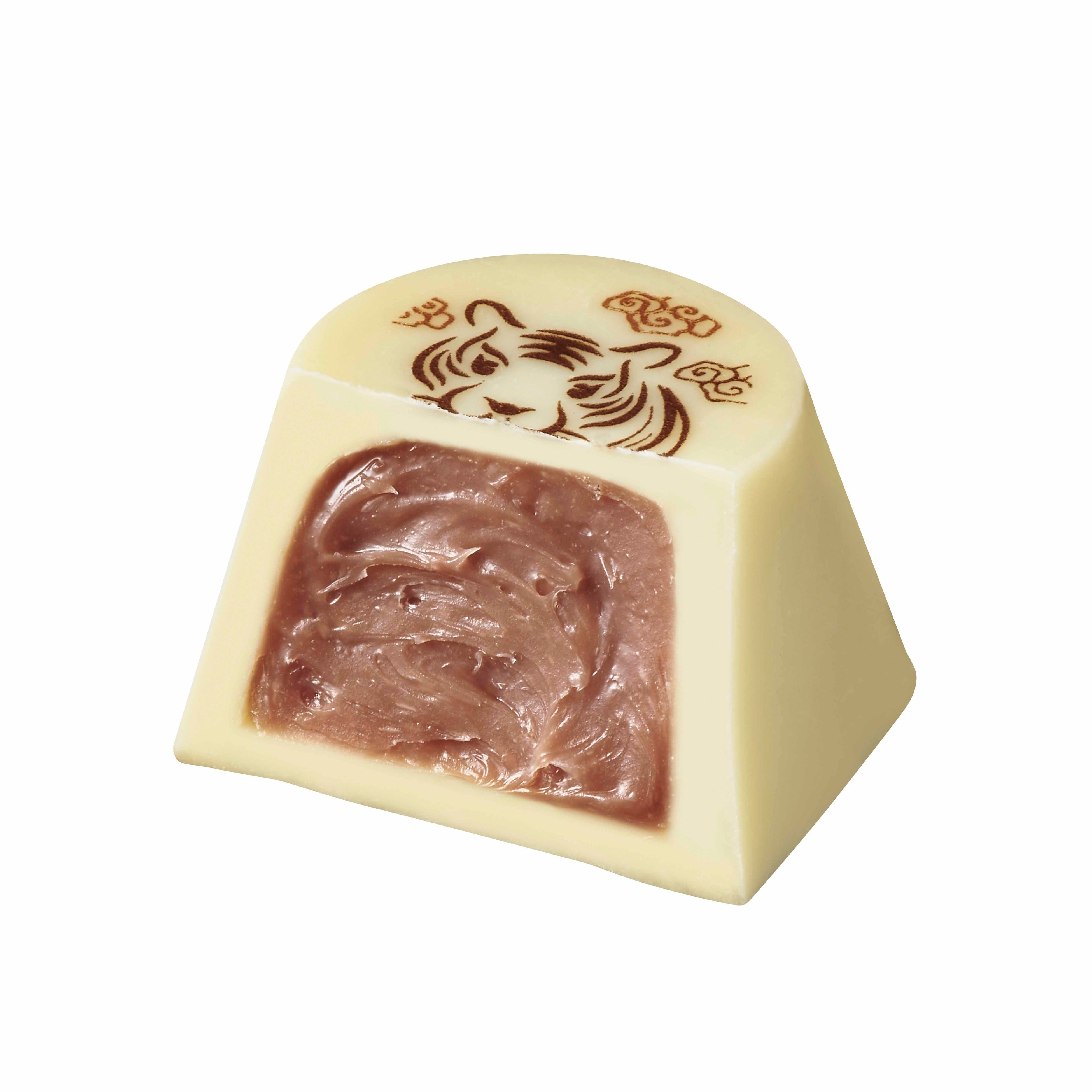 サクサクとしたライスクリスプの食感が楽しいぺカンプラリネを、 繊細な口当たりのミルクチョコレートで包み、2022年の干支「寅」のモチーフで飾りました。