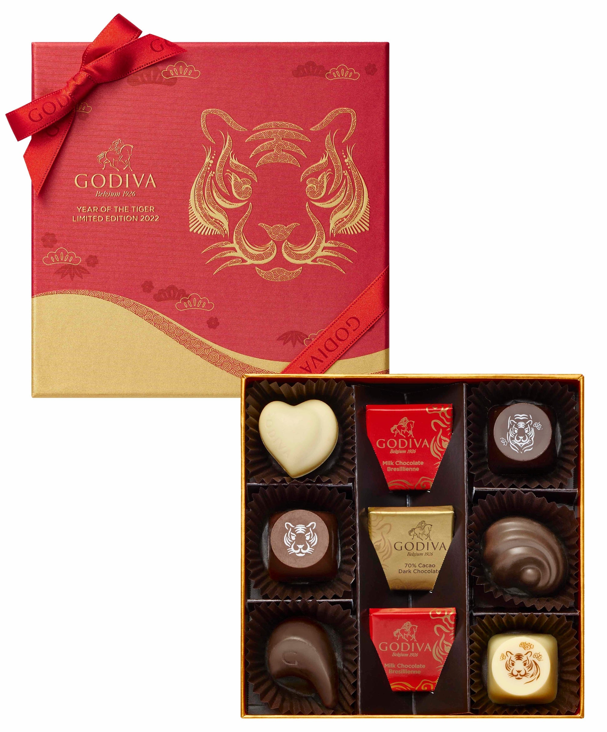 「ゴディバ ニューイヤー コレクション」は、2022年の干支である“寅”をシャープで強い印象でデザインし、さらに新年の祝賀ムードを表す梅や松を合わせ、2022年の繁栄と華やかさを表現したパッケージに、限定チョコレートや限定カレ、人気の定番チョコレートをアソートメントしたコレクションです。