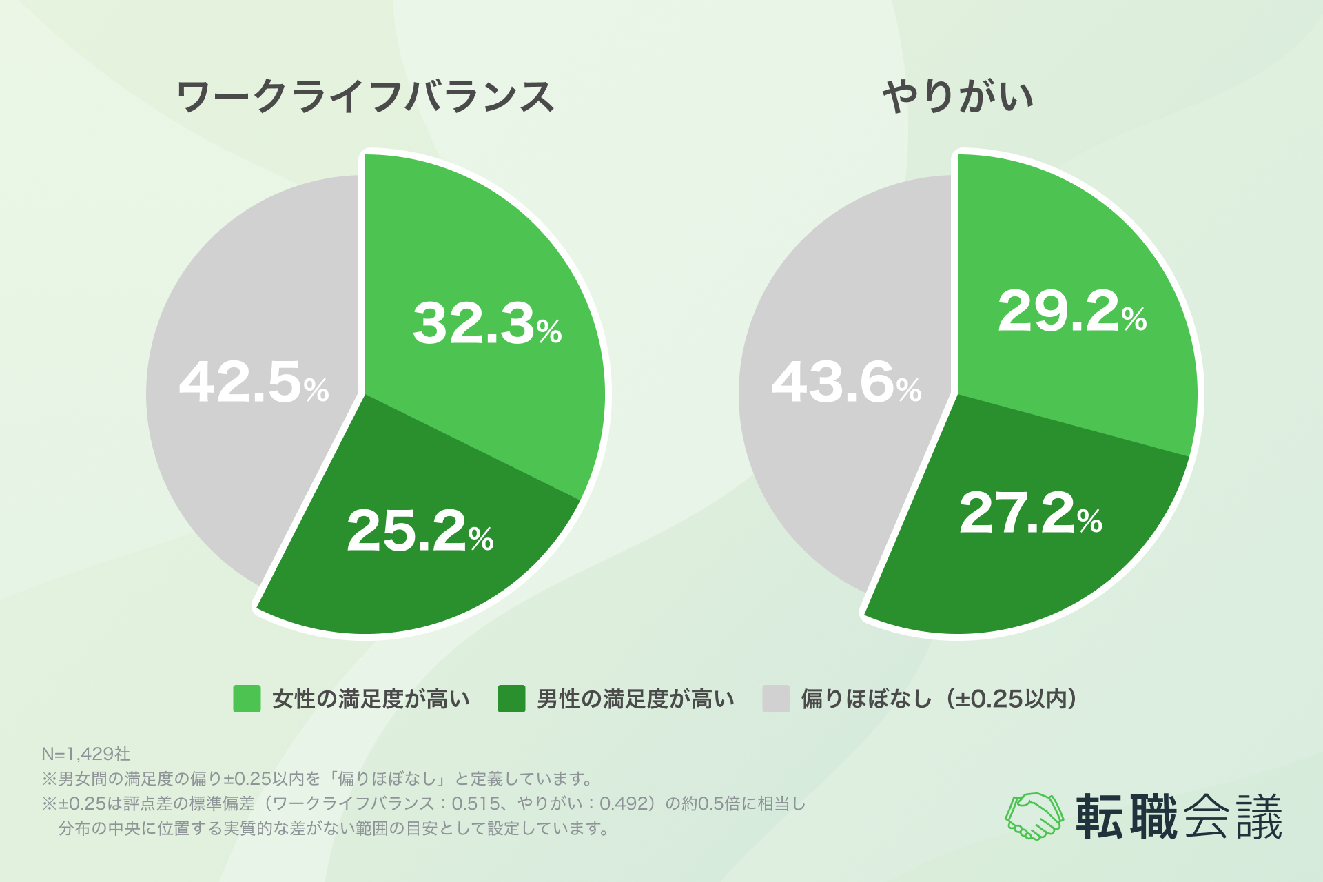 ※±0.25は評点差の標準偏差(ワークライフバランス:0.515、やりがい:0.492)の約0.5倍に相当し、分布の中央に位置する実質的な差がない範囲の目安として設定しています。