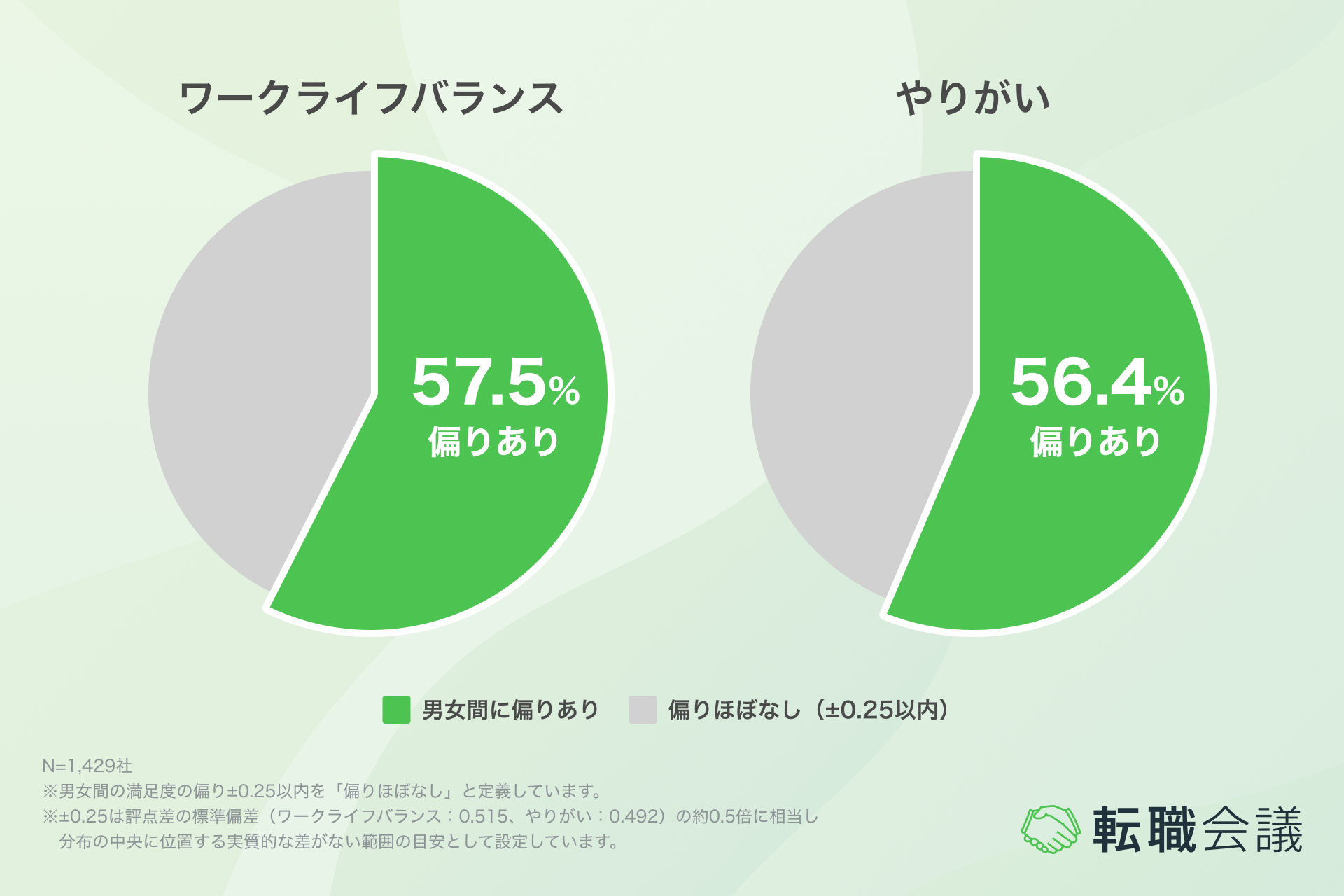 「ワークライフバランス」「やりがい」の男女別満足度を分析したところ、6割近くの企業で男女いずれかの評価に±0.25を超える偏りが見られました。