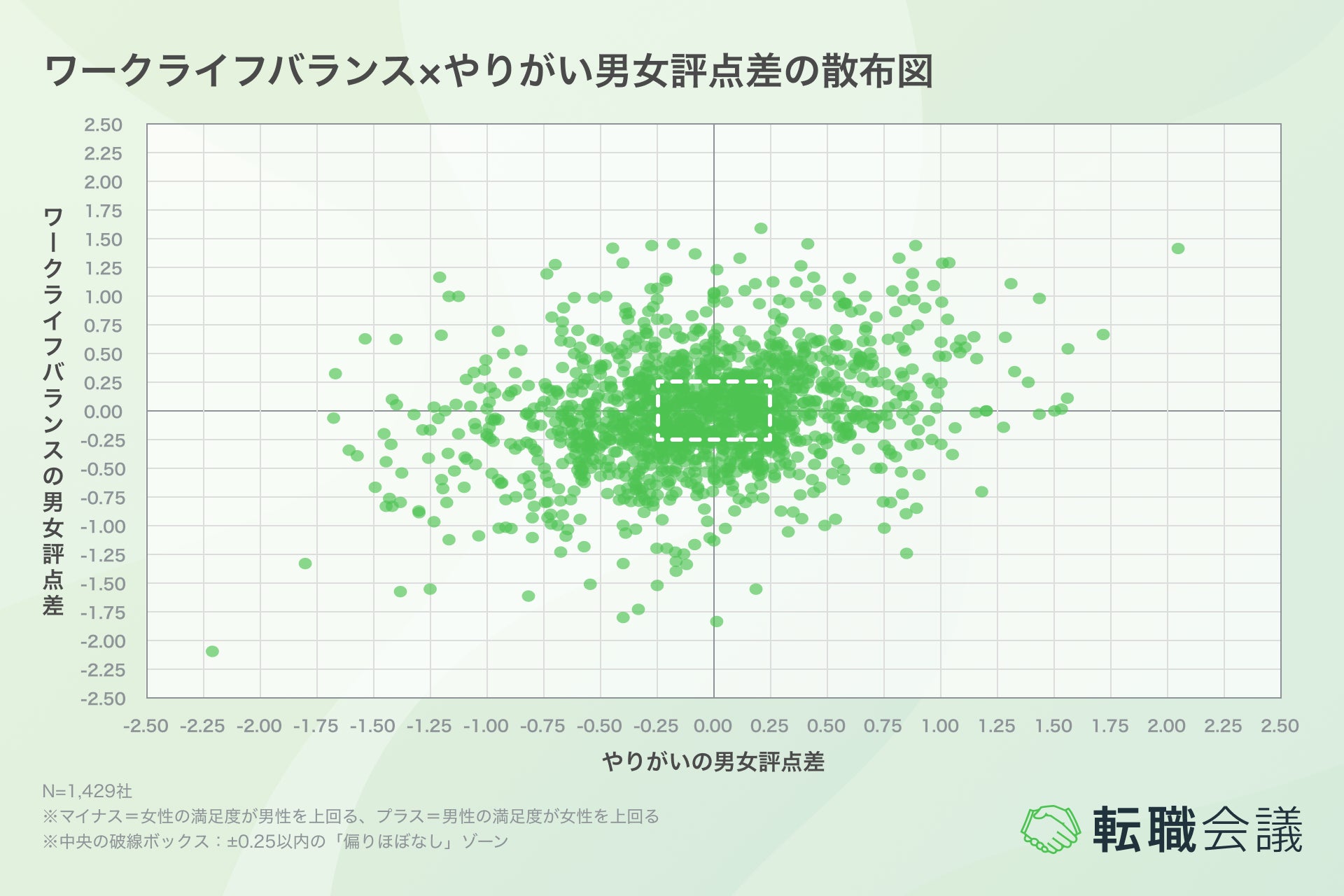 さらに、ワークライフバランスとやりがいの男女評点差を2軸にとった散布図(n=1,429社)から、以下の構造が浮かび上がりました。