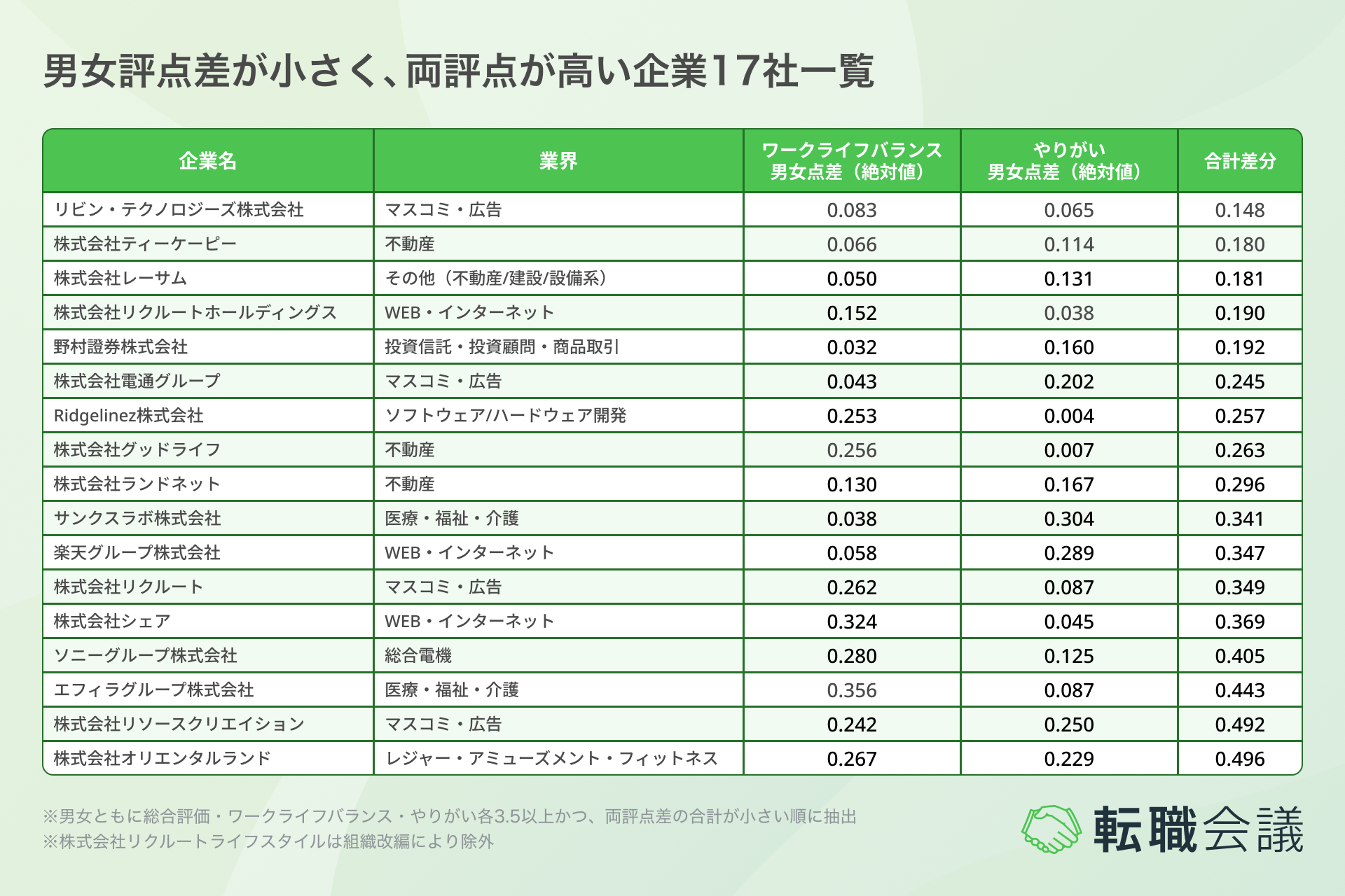 転職会議では、サンプルとして男女ともに「ワークライフバランス・やりがい」の評点が高く、男女間の偏りが小さい企業17社を抽出しました。業界としては、マスコミ・広告(4社)、不動産系(4社)、WEB・インターネット(3社)の企業が多く見られます。