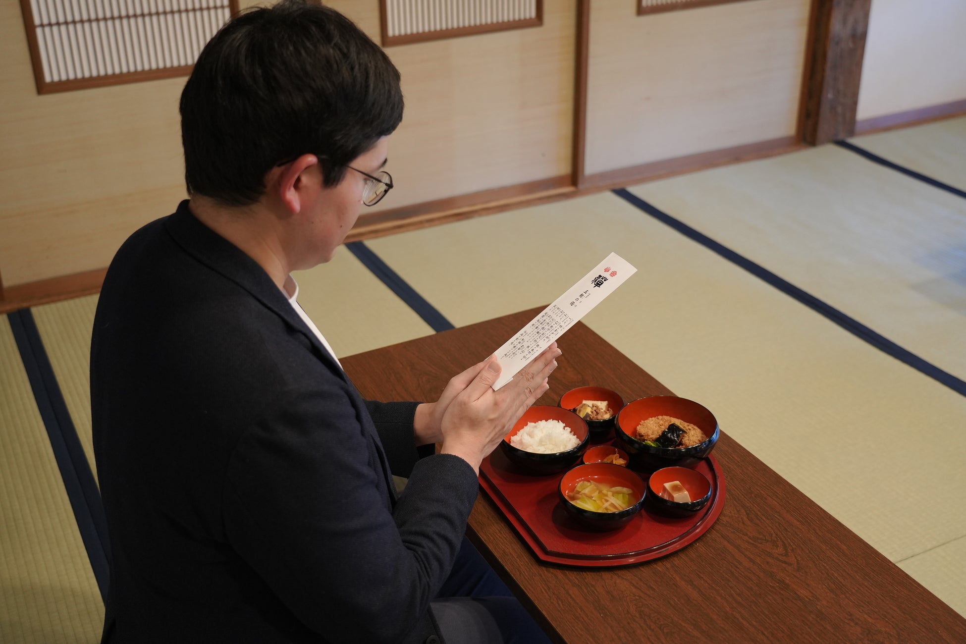 高血圧専門医の監修により、1食当たりの食塩相当量を2g未満に抑えた特別な精進料理をご用意しました。お味噌汁や煮物には、昆布だしを使用し、旨みを加えました。また、調味料を減らす代わりにたっぷり加えた野菜は、大きめに調理し食感を残すことで、減塩でも満足感が得られる工夫をしています。塩分を気を付けたい漬物も、減塩のものをご用意しました。これらを、ご住職のご指導による精進料理ならではのお作法でお召し上がりいただきました。