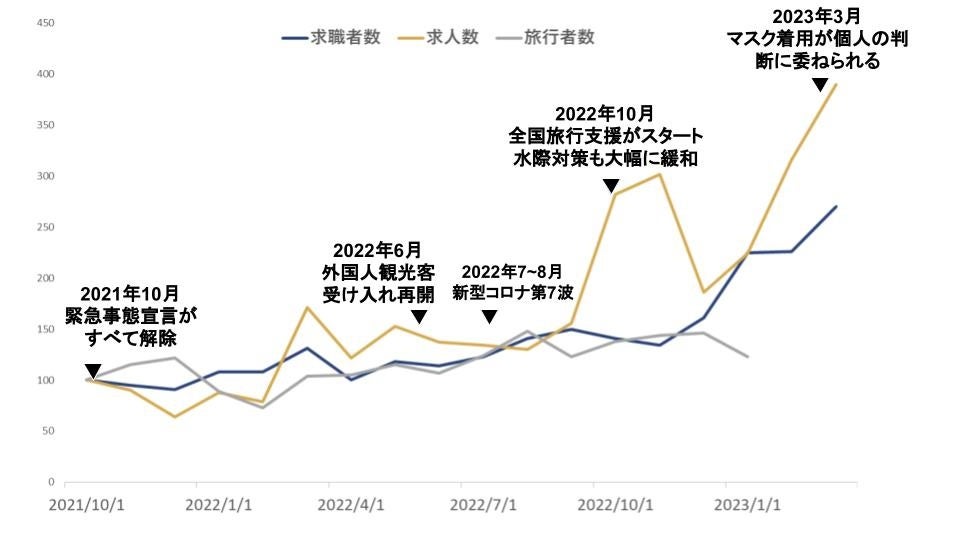 2022年10月に水際対策が大幅に緩和したタイミングで求人数が大きく増加。10、11月は2.5〜3倍と高い水準となった。さらにマスクの着用が個人の判断とされた2023年3月には求人数が4倍近く、求職者数は2.5倍を超える結果となった。