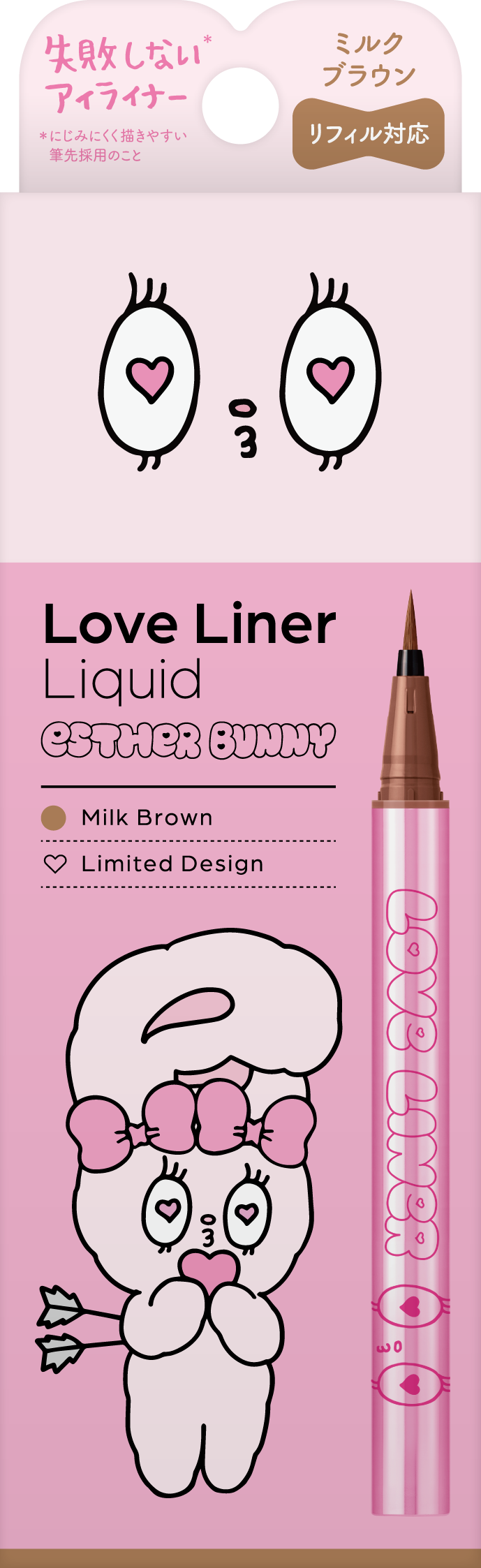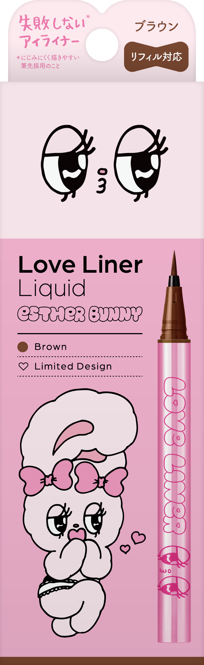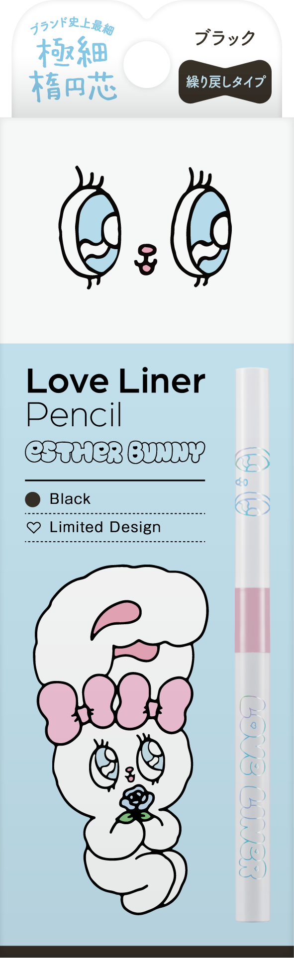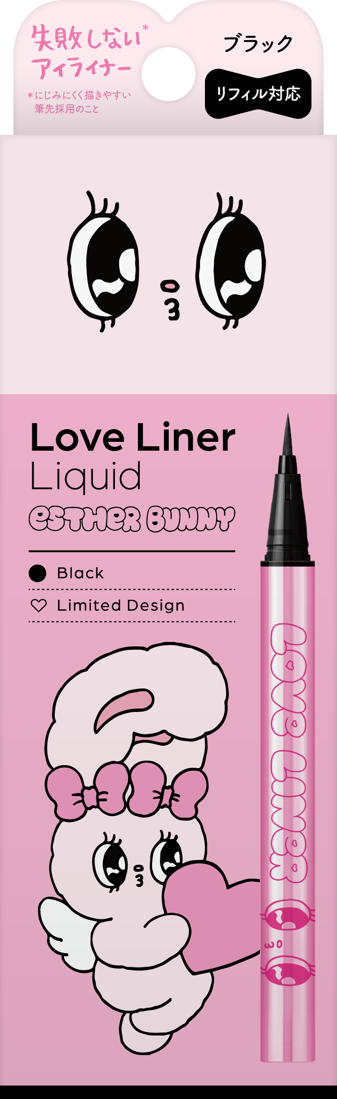 2025年3月にペンシルアイライナー、同年9月にリキッドアイライナーを刷新したラブ・ライナー。そのリニューアル後初となるコラボレーションデザインとして「エスターバニー」の登場です。ラブ・ライナーの“カワイイ”と、エスターバニーの大きな瞳とPOPでガーリーな世界観を掛け合わせ、甘さと遊び心を詰め込んだ特別なデザインに仕上げました。
