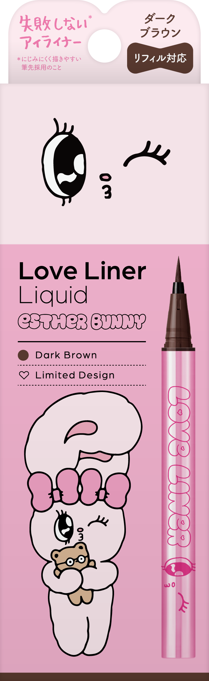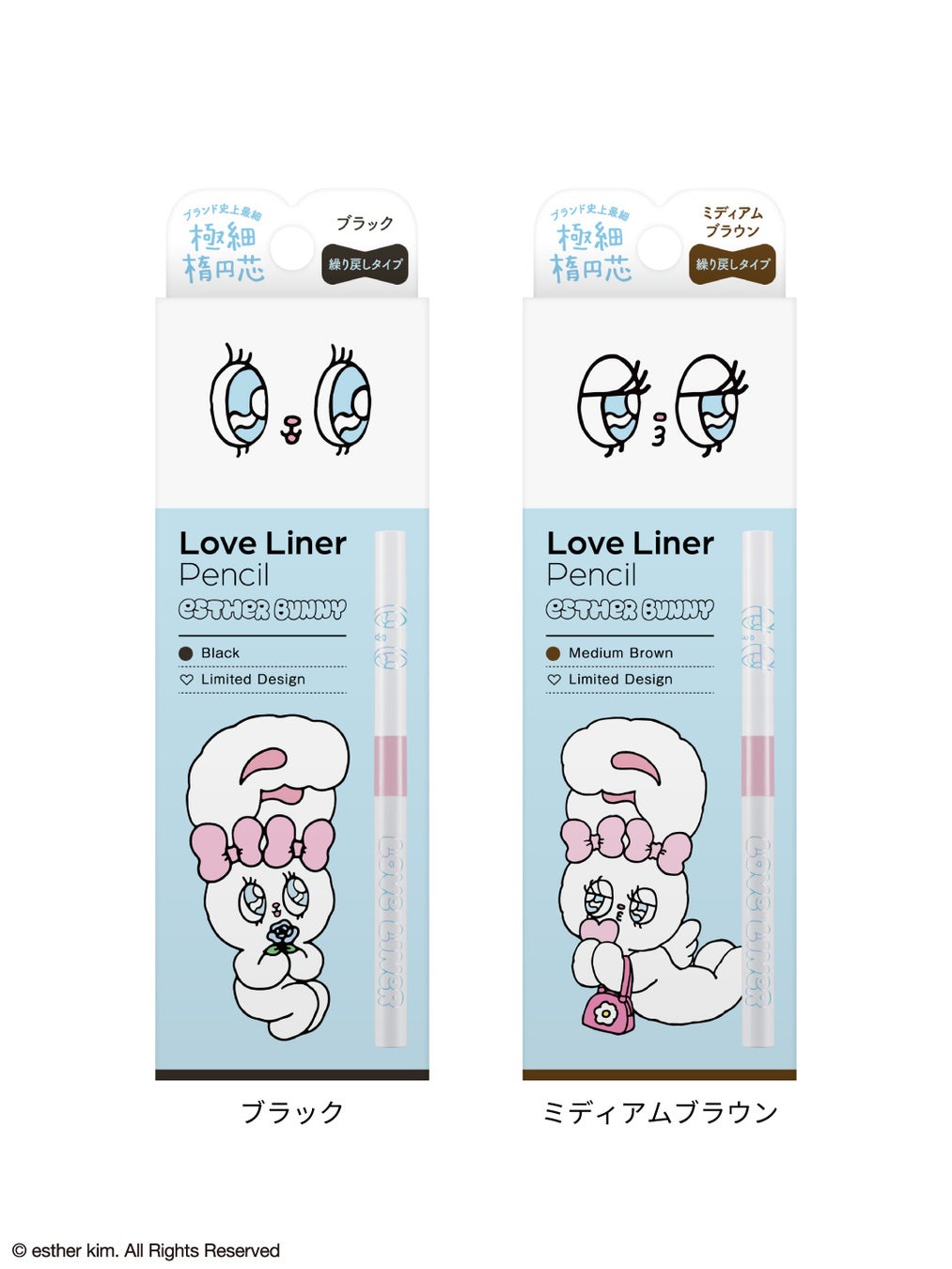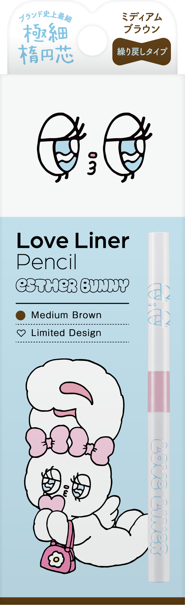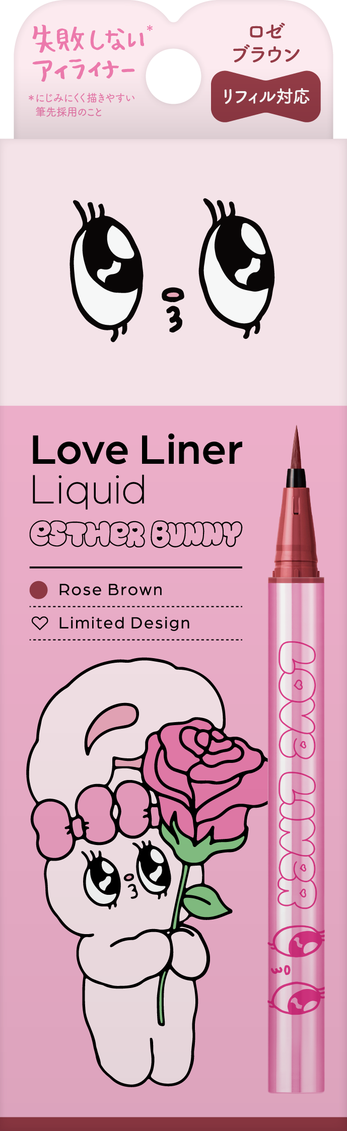 2025年3月にペンシルアイライナー、同年9月にリキッドアイライナーを刷新したラブ・ライナー。そのリニューアル後初となるコラボレーションデザインとして「エスターバニー」の登場です。ラブ・ライナーの“カワイイ”と、エスターバニーの大きな瞳とPOPでガーリーな世界観を掛け合わせ、甘さと遊び心を詰め込んだ特別なデザインに仕上げました。