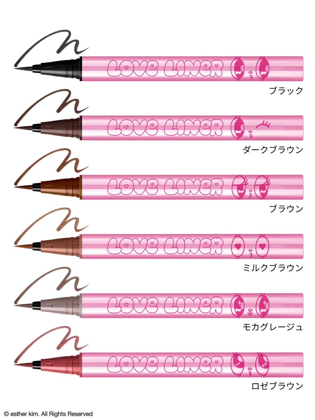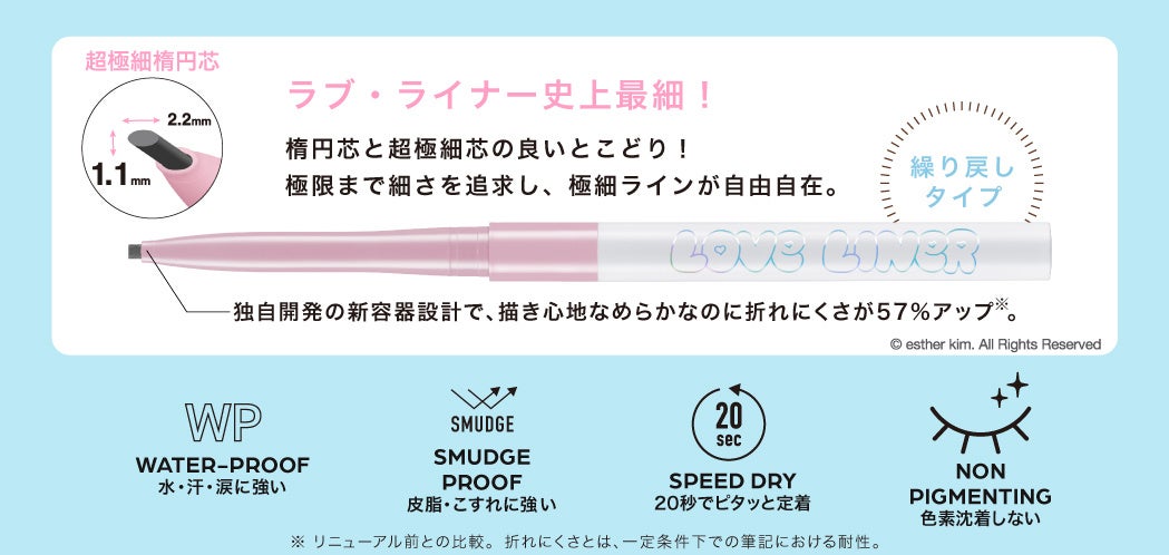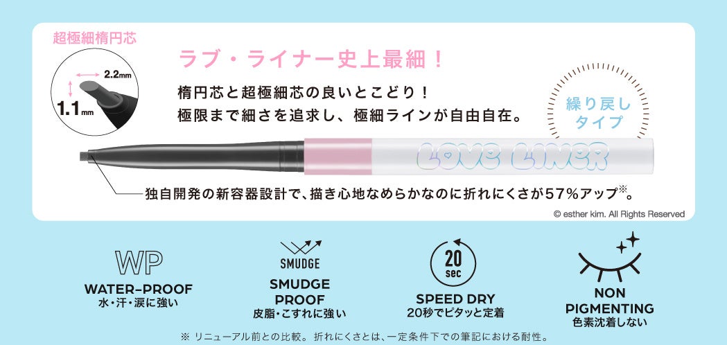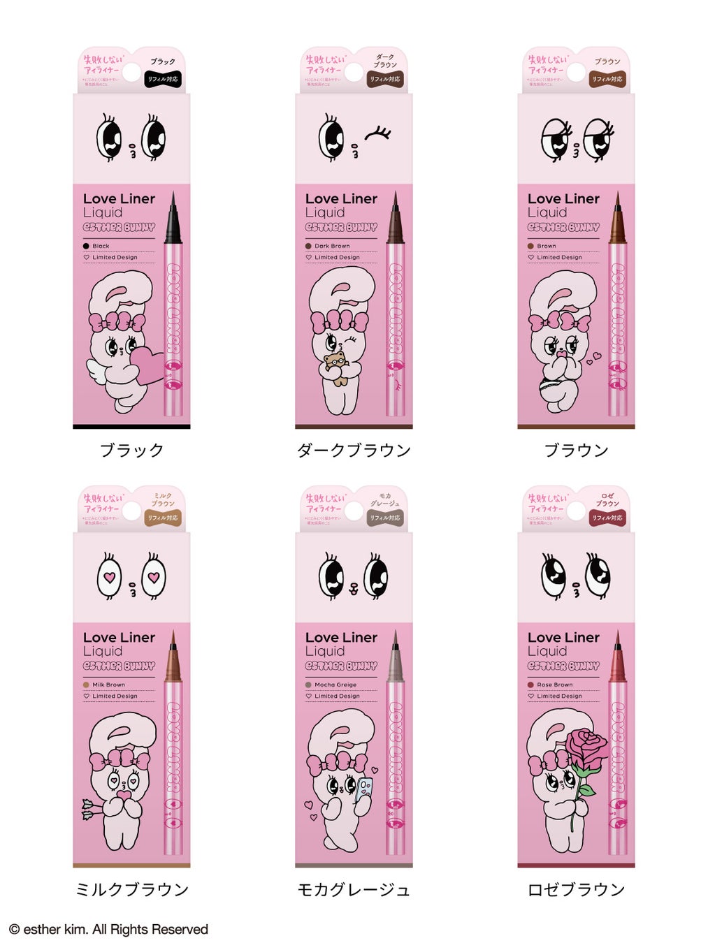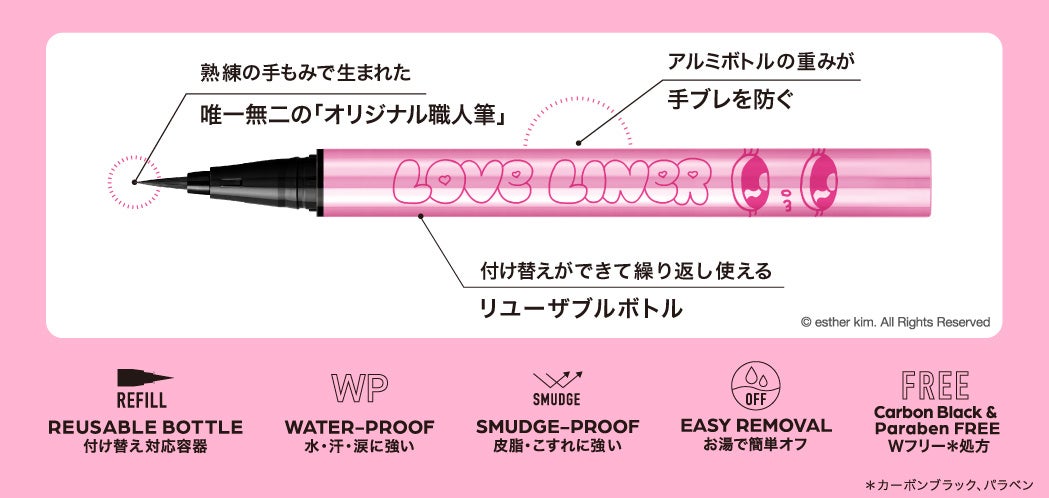 2025年3月にペンシルアイライナー、同年9月にリキッドアイライナーを刷新したラブ・ライナー。そのリニューアル後初となるコラボレーションデザインとして「エスターバニー」の登場です。ラブ・ライナーの“カワイイ”と、エスターバニーの大きな瞳とPOPでガーリーな世界観を掛け合わせ、甘さと遊び心を詰め込んだ特別なデザインに仕上げました。