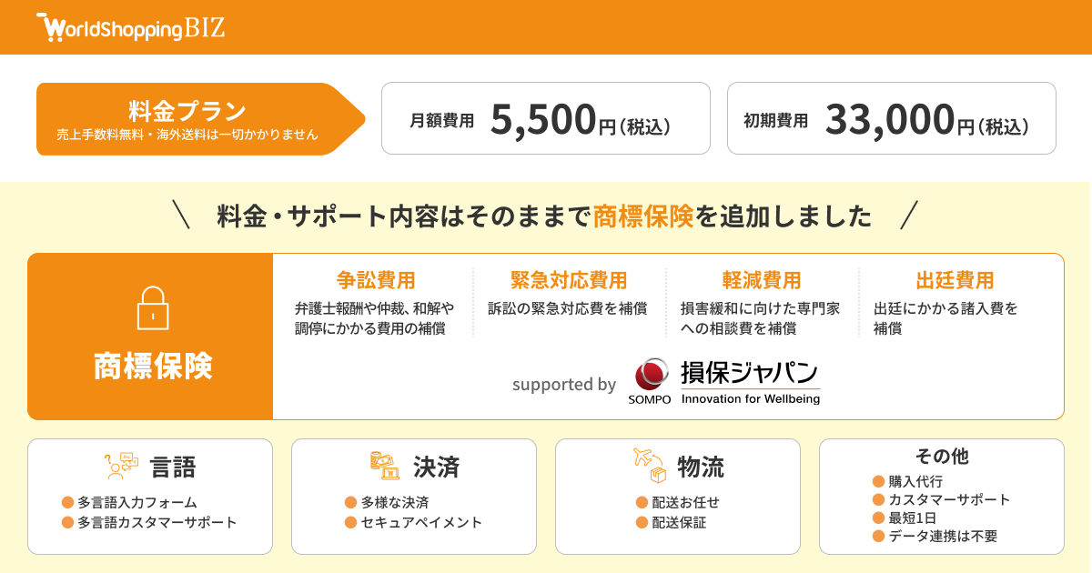 しかしながら、企業によっては取扱商材がどの国で商標権登録されているか不明瞭な部分があることから、今回、損保ジャパンが提供する知財侵害における争訟費用(防御費用)を一定の条件のもとで補償する知財保険を活用し、「WorldShopping BIZ」を利用する全ての事業者に対する海外での商標権侵害リスクへの補償を提供し、より安心・安全な越境ECサービス体制を構築しました。