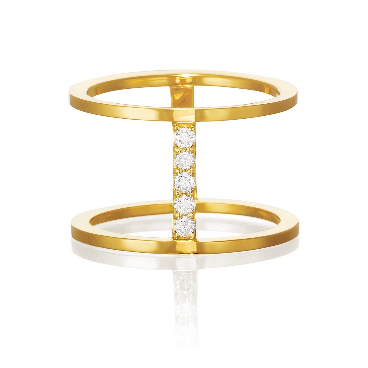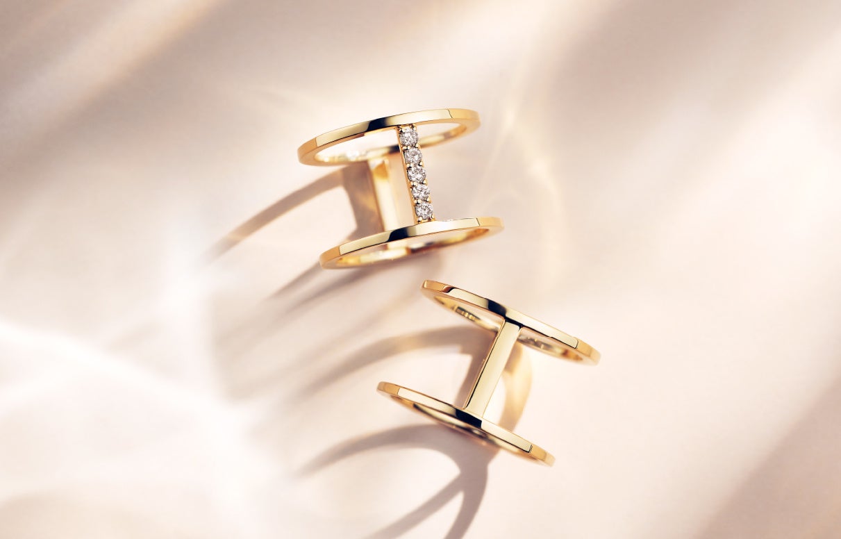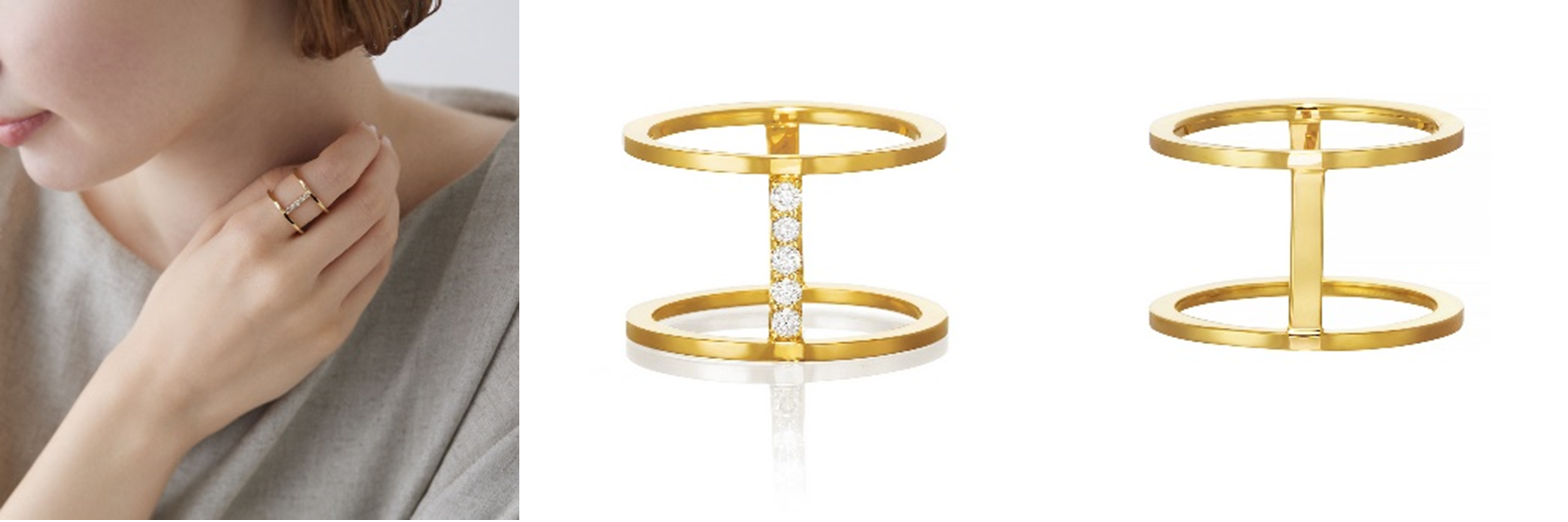 手持ちのリングとも合わせやすい、ミニマルでモードなデザインのリング。2本の細いリングを、力強く煌めく5石のダイヤモンドのラインでつなぎました。アウトラインはあえて角ばったデザインにすることで、凛としたクールさと自立した大人の魅力を演出。繊細な中にもピリッとモダンな個性がある、これからの大人の理想のスタイルを手元にも反映したいという三尋木さんの想いが込められたアイテムです。