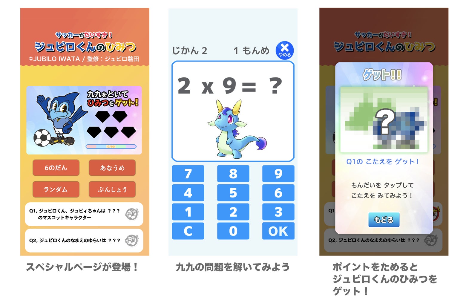 九九の苦手意識が強くなる前に、お子さまがゲーム感覚で楽しく学習できるように開発された知育アプリです。九九の問題を正解するとポイントが貯まり、そのポイントに応じてモンスターをゲットできることが大きな特徴です。コラボコンテンツでは、九九の問題を解くことでジュビロ磐田のクラブマスコットである「ジュビロくん」「ジュビィちゃん」の5つの秘密をゲットすることができます。