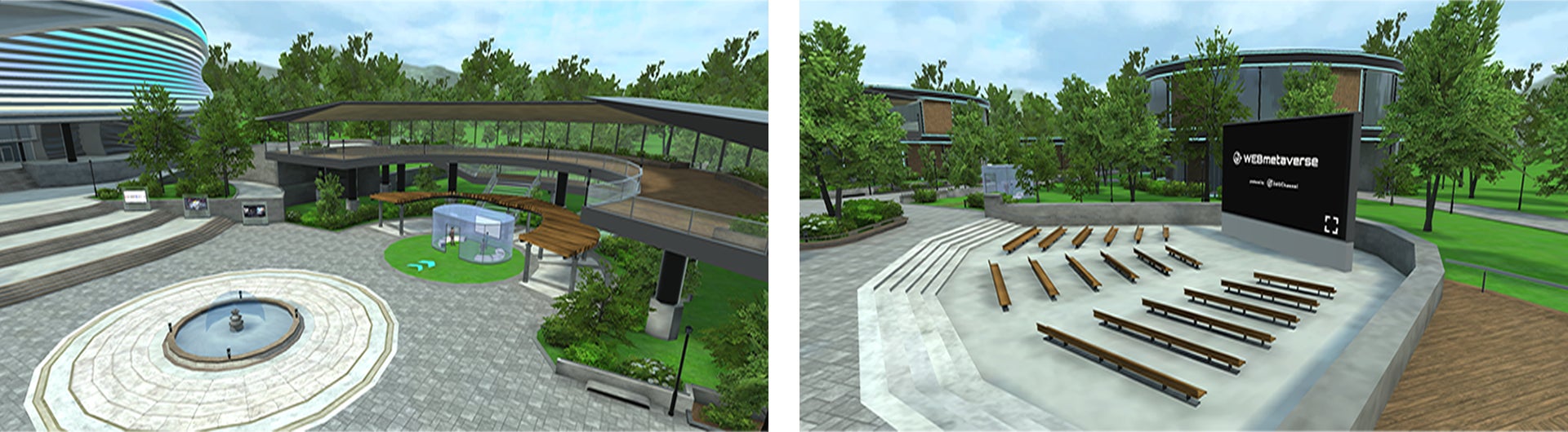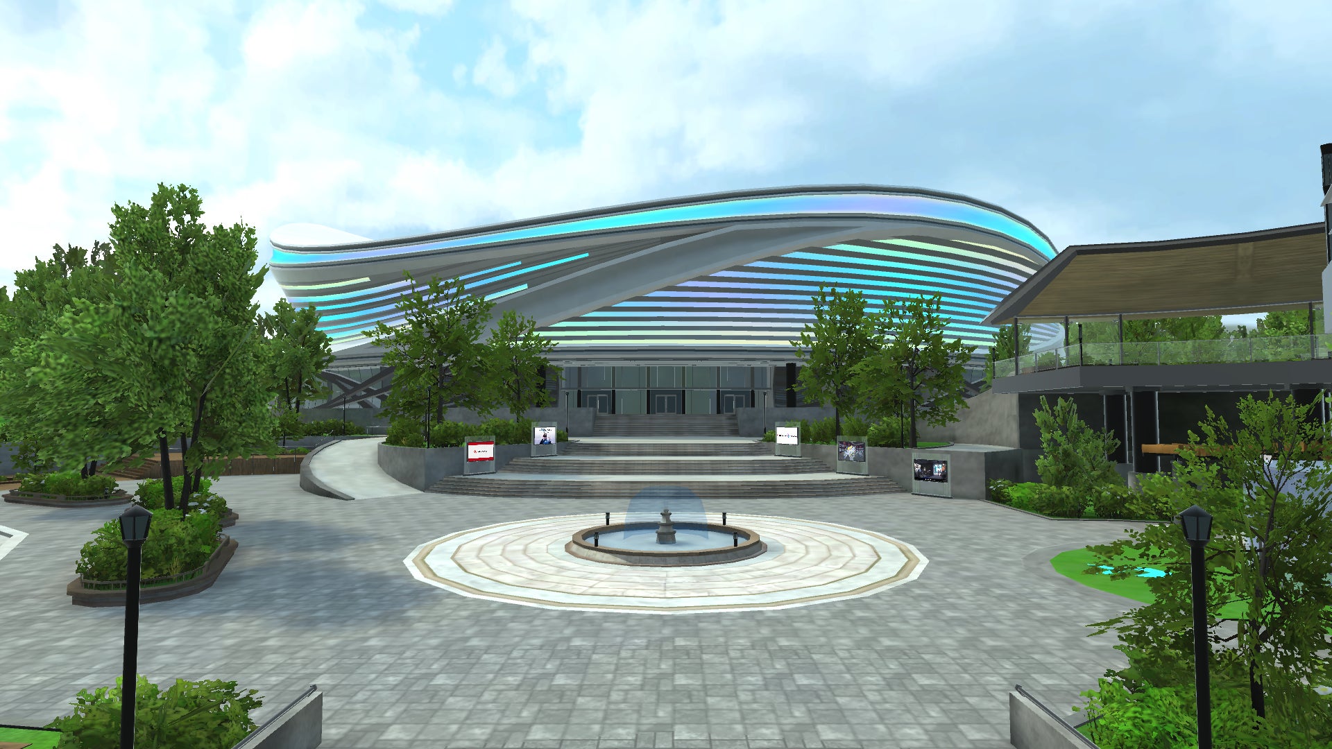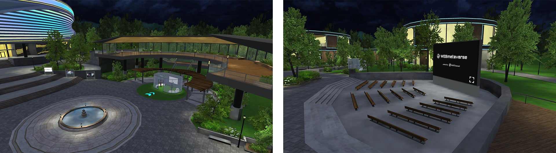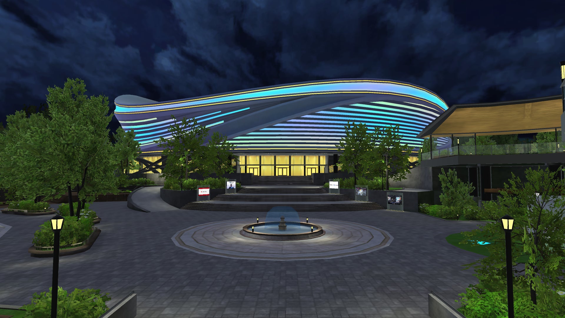 初期位置に設定されることが多いエリアです。ユーザ様は一度屋外エリアに入室し、そこを拠点に各方向に設置されたイベント空間に向かいます。看板を設置し、エリアマップの表示や、イベントの告知なども可能となっております。本エリアのみでも完結できるよう、大型モニターの設置や個別音声通話ブースなども設けております。さらに、昼と夜のご選択、切り替えも可能です。