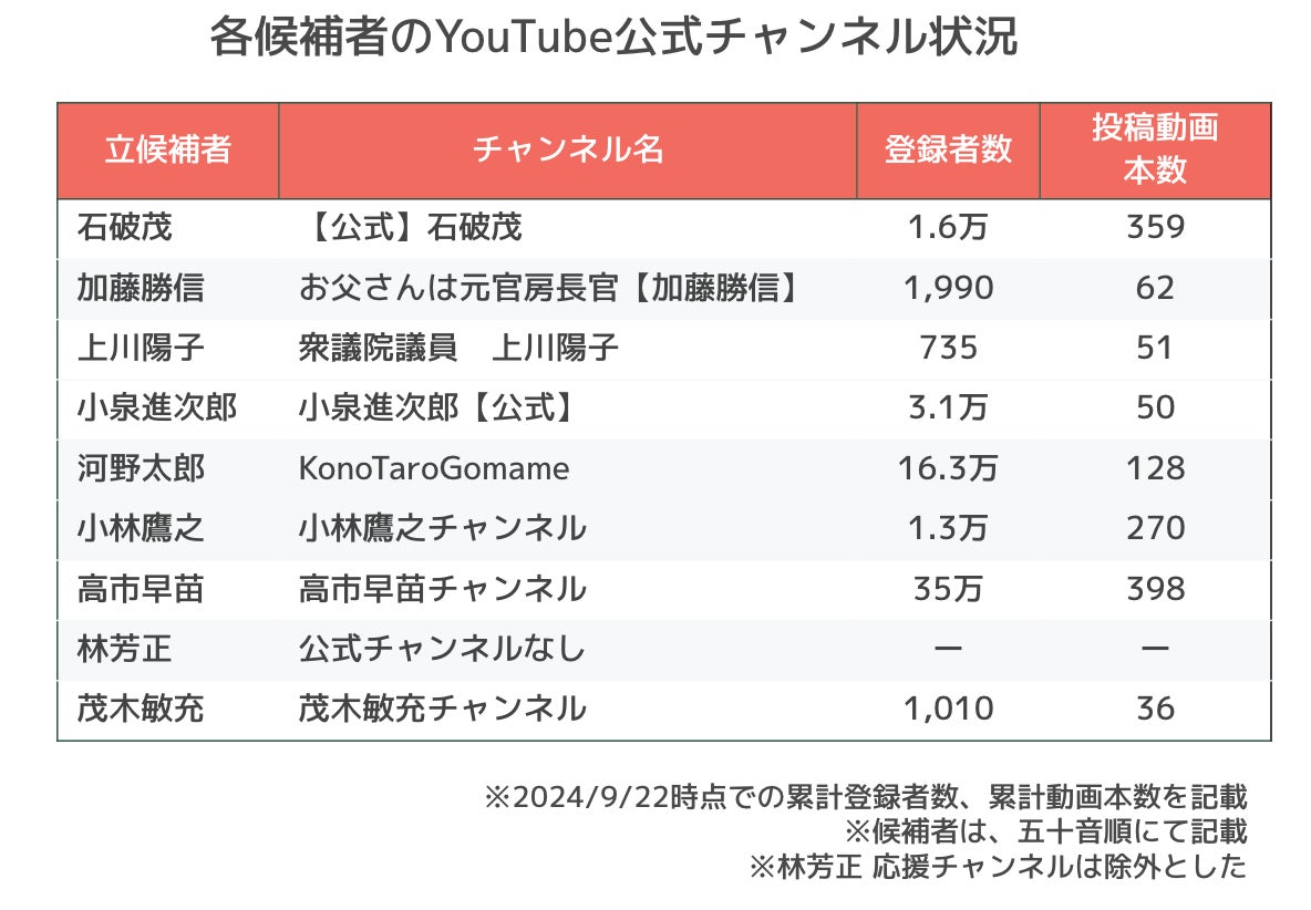 中でもYouTubeは、特に選挙活動に向いていると言えます。短い動画で広くリーチを獲得できるだけではなく、長い動画で、候補者の理念や考えの訴求をしっかり行うことができるからです。実際に今回の総裁選では、林芳正氏を除く8名の候補者が公式のYouTubeチャンネルを保有しており、積極的に自身のチャンネルを活用し動画投稿している候補者もいました。