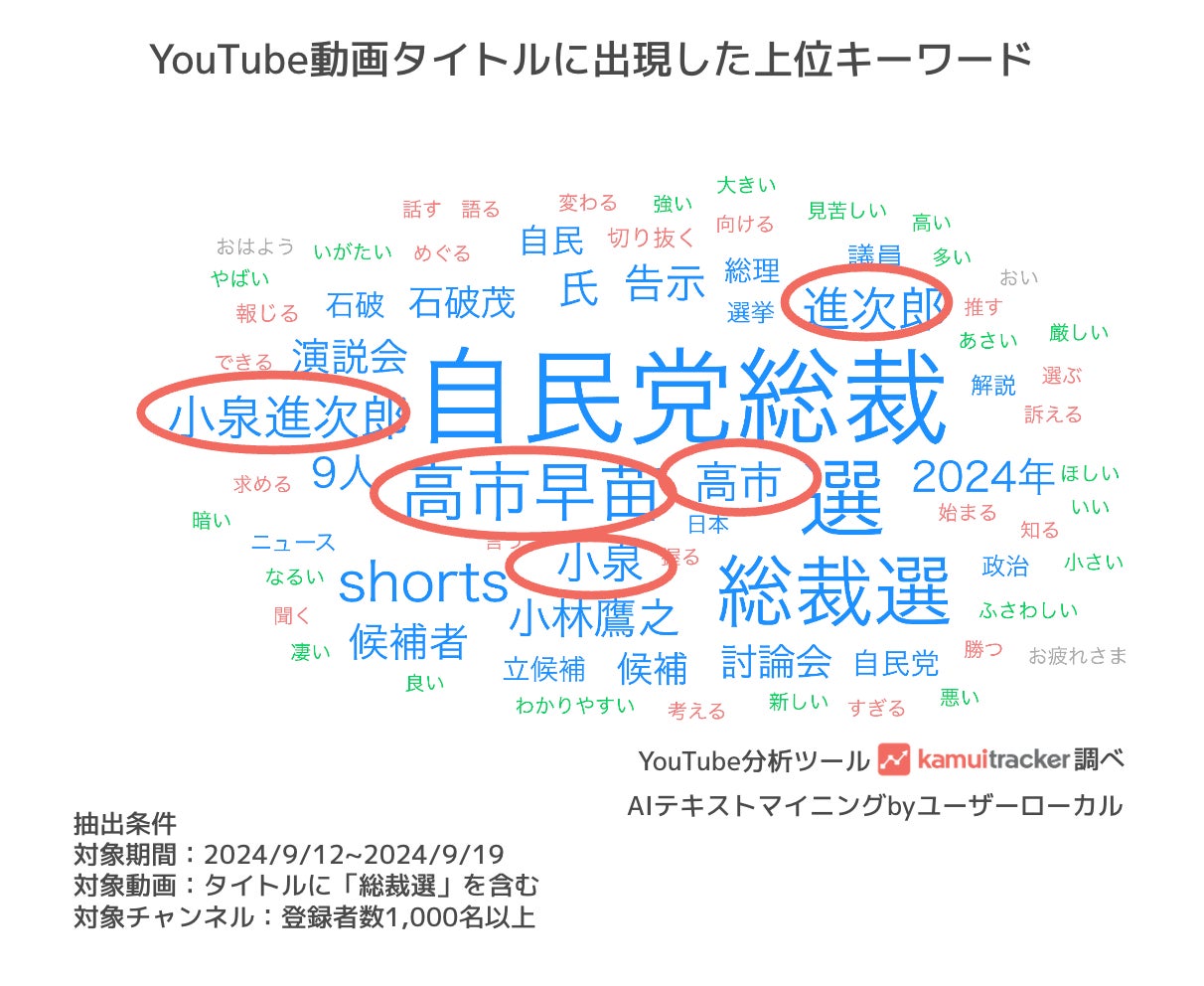 総裁選に関する動画のタイトルには、立候補者の名前が多く含まれていました。その中でも、「小泉」、「進次郎」、「高市」を含め、高市氏と小泉氏の名前が多く使われていました。2名に対する注目が高いことがわかります。