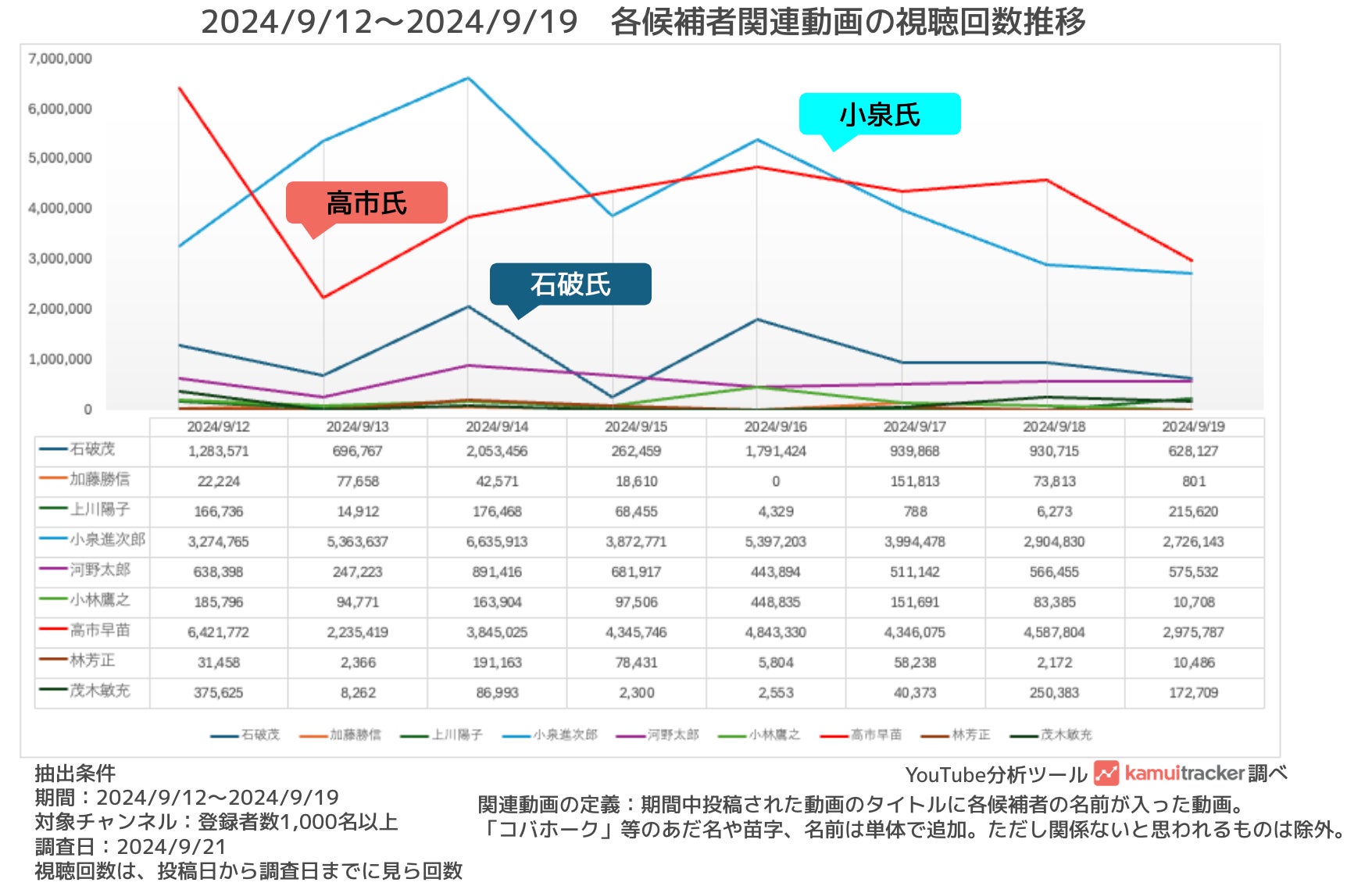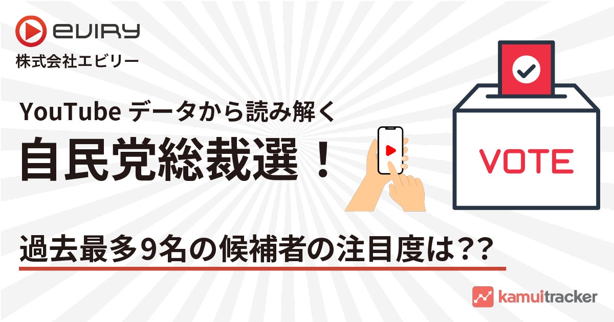 株式会社エビリー(本社:東京都渋谷区、代表取締役社長:中川恵介 以下、エビリー)は、9月27日(金)に開票が行われる自民党総裁選2024(以下、総裁選)について、登録者数1,000名以上の国内YouTubeチャンネルの視聴データが分析できるkamui tracker(カムイトラッカー)を使って、YouTube上でどのくらい各候補者が注目を浴びていたのか分析しました。