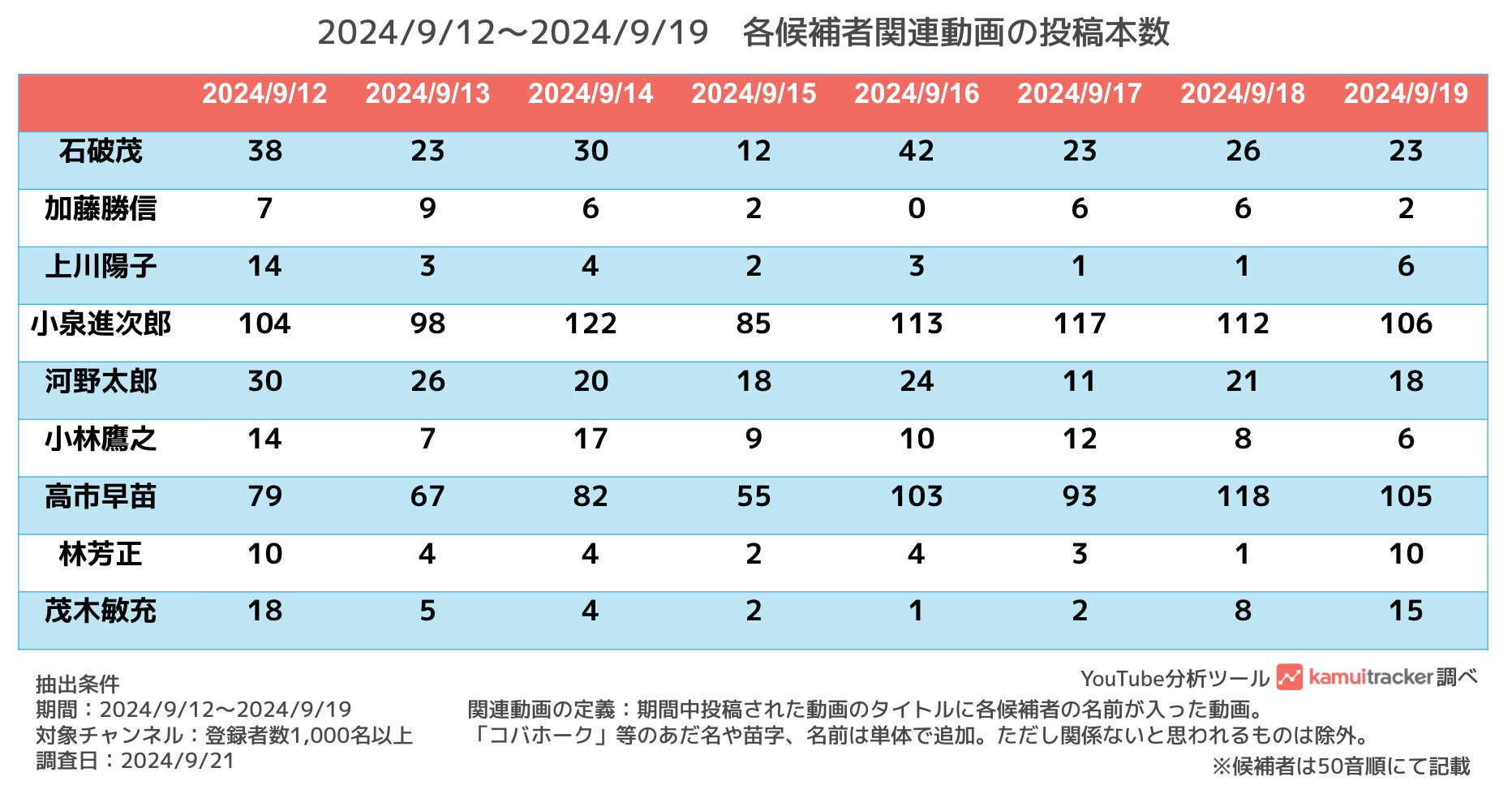 つぎに、告示日である9/12から9/19までの候補者に関する動画の投稿本数と視聴回数を調査しました。動画のタイトルに候補者の名前が含まれるかどうかで関連動画を判定し、集計を行いました。