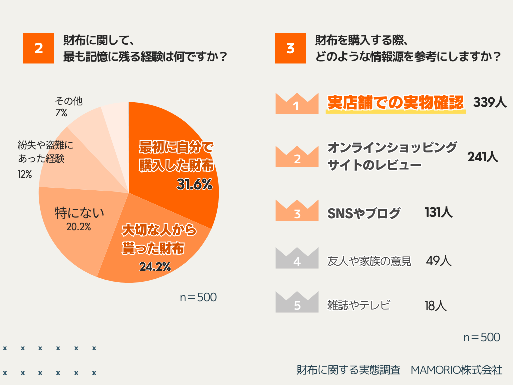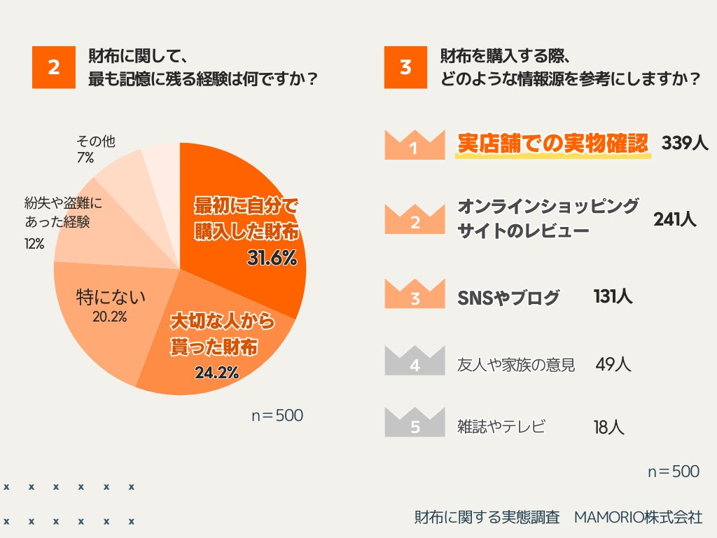 ・財布に関するもっとも記憶に残る経験として、31.6%の人が「最初に自分で購入した財布」24.2%の人が「大切な人からもらった財布」と回答