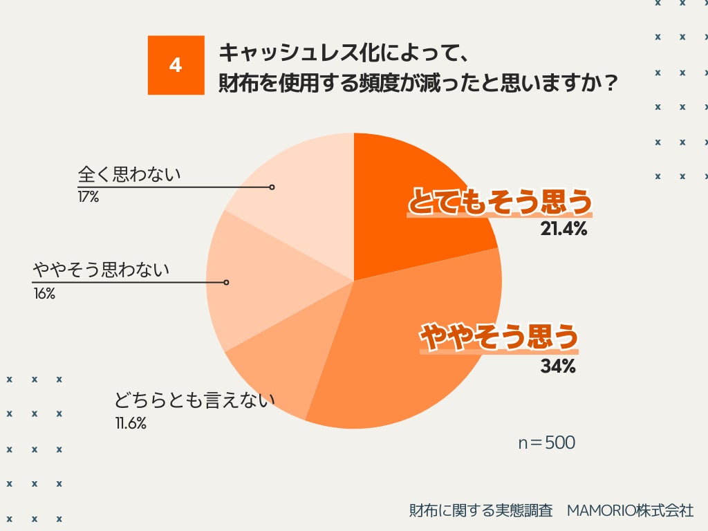 そして今回の調査目的のひとつでもある「キャッシュレス化」というテーマにおいて、「キャッシュレス化によって、財布を使用する頻度が減ったと思いますか?」と質問をしたところ、半数以上がキャッシュレス化によって「財布の使用頻度が減ったと感じる」と回答しました。