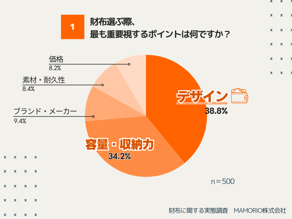 まず、現代の人が「財布を選ぶ際、最も重視するポイント」について質問をしたところ、回答者の38.8%が「デザイン」を財布を選ぶ上での最優先事項として挙げました。