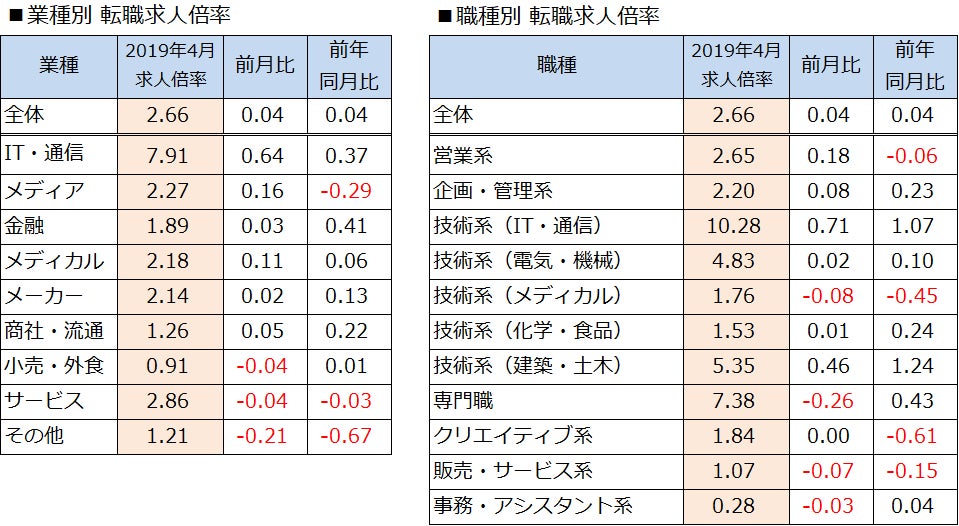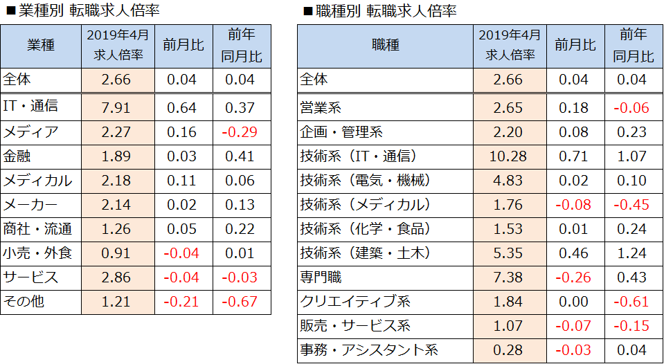 ・2019年4月の求人倍率は2.66倍(前月比+0.04pt/前年同月比+0.04pt)。