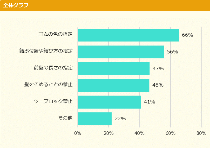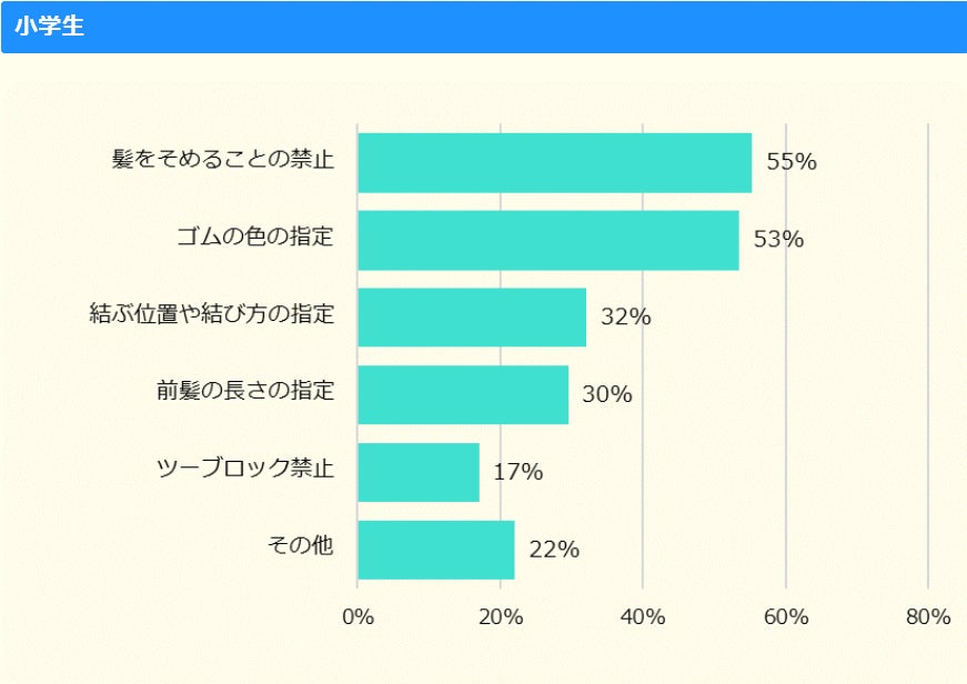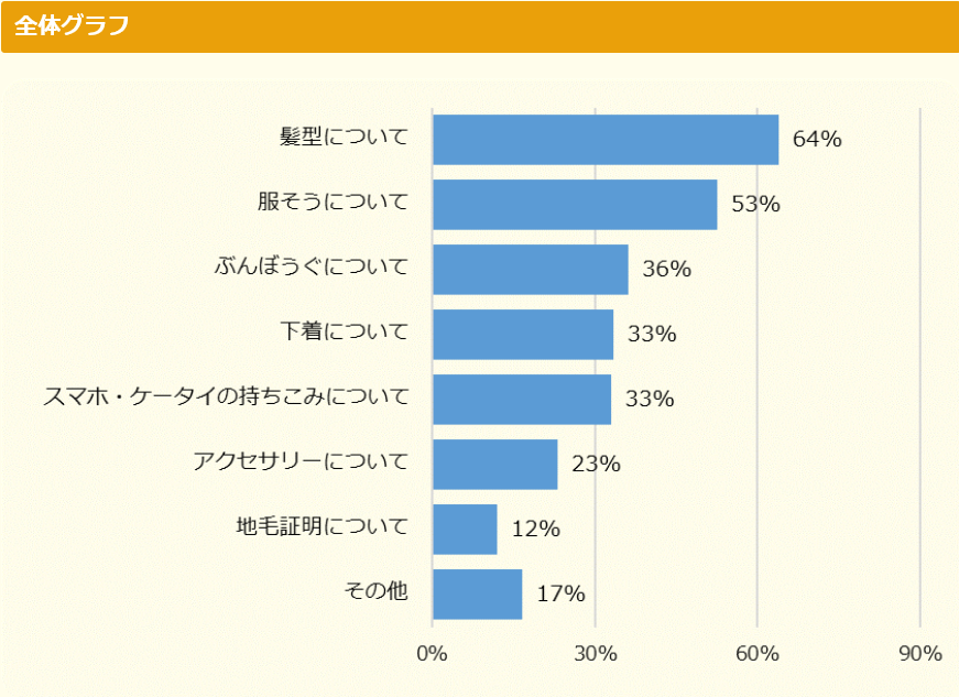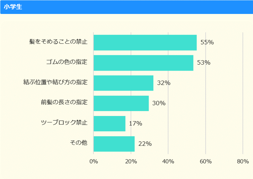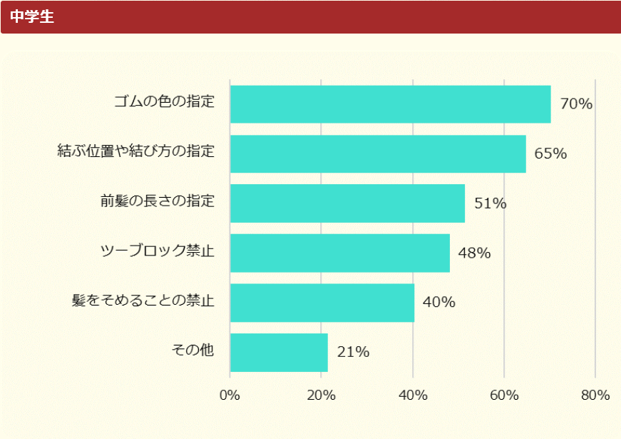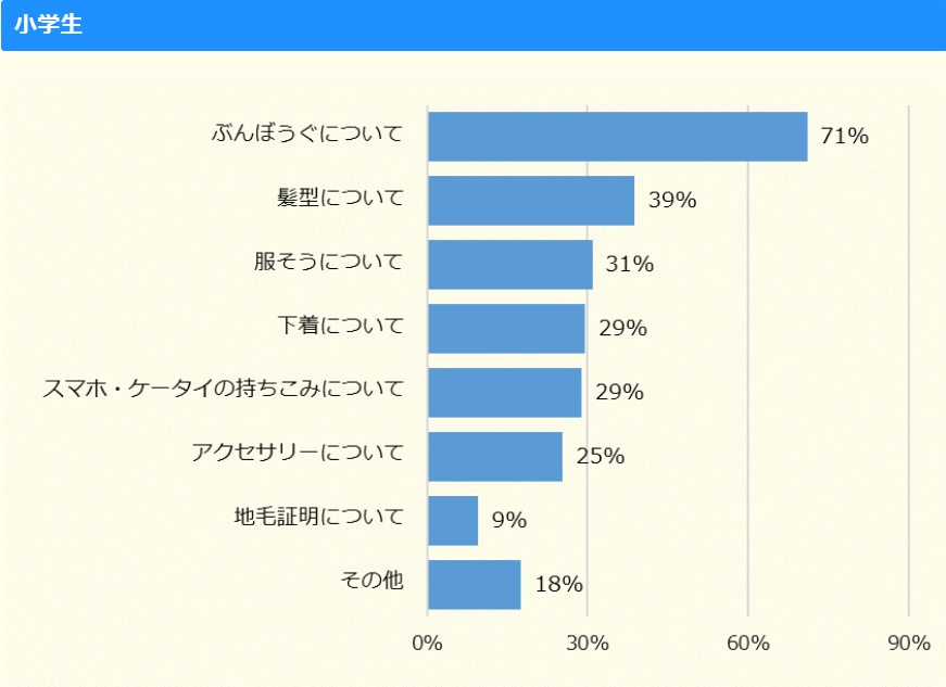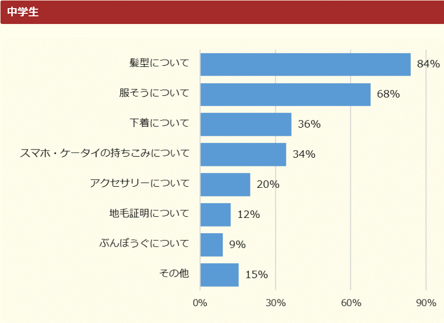 おかしいと思う決まり・校則について「ある」と答えた子どもたちは全体で81%、中学生では88%に上り、校則に対して不満を抱いていることが分かりました。