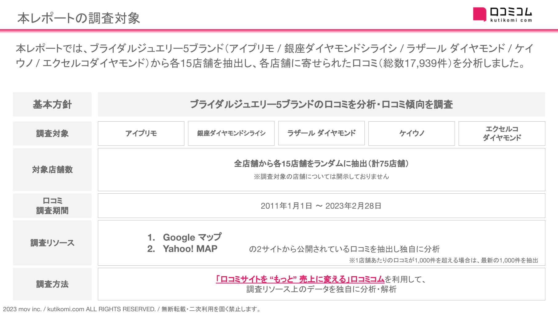本レポートでは、ブライダルジュエリー5ブランド(アイプリモ / 銀座ダイヤモンドシライシ / ラザール ダイヤモンド / ケイウノ / エクセルコダイヤモンド)から各15店舗を抽出し、各店舗に寄せられた口コミ(総数17,939件)を分析しました。