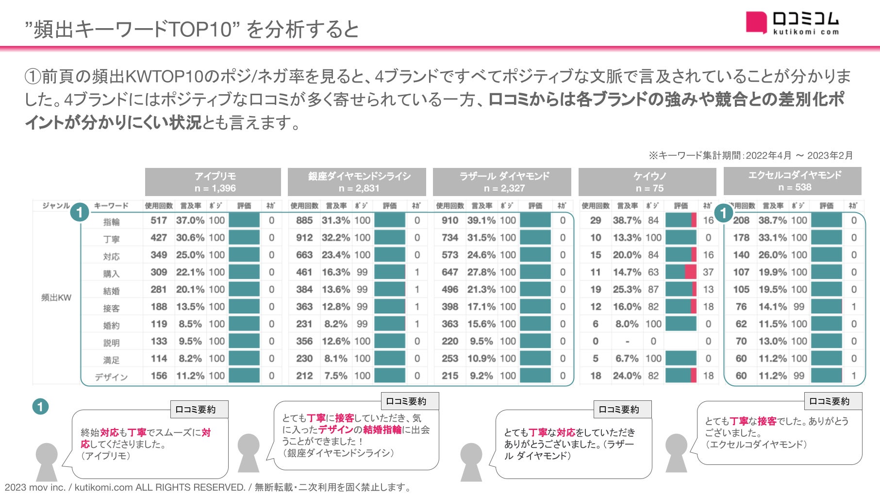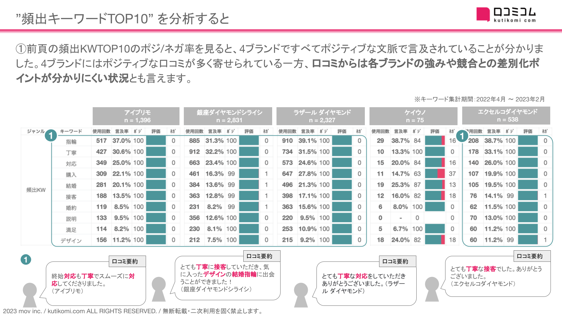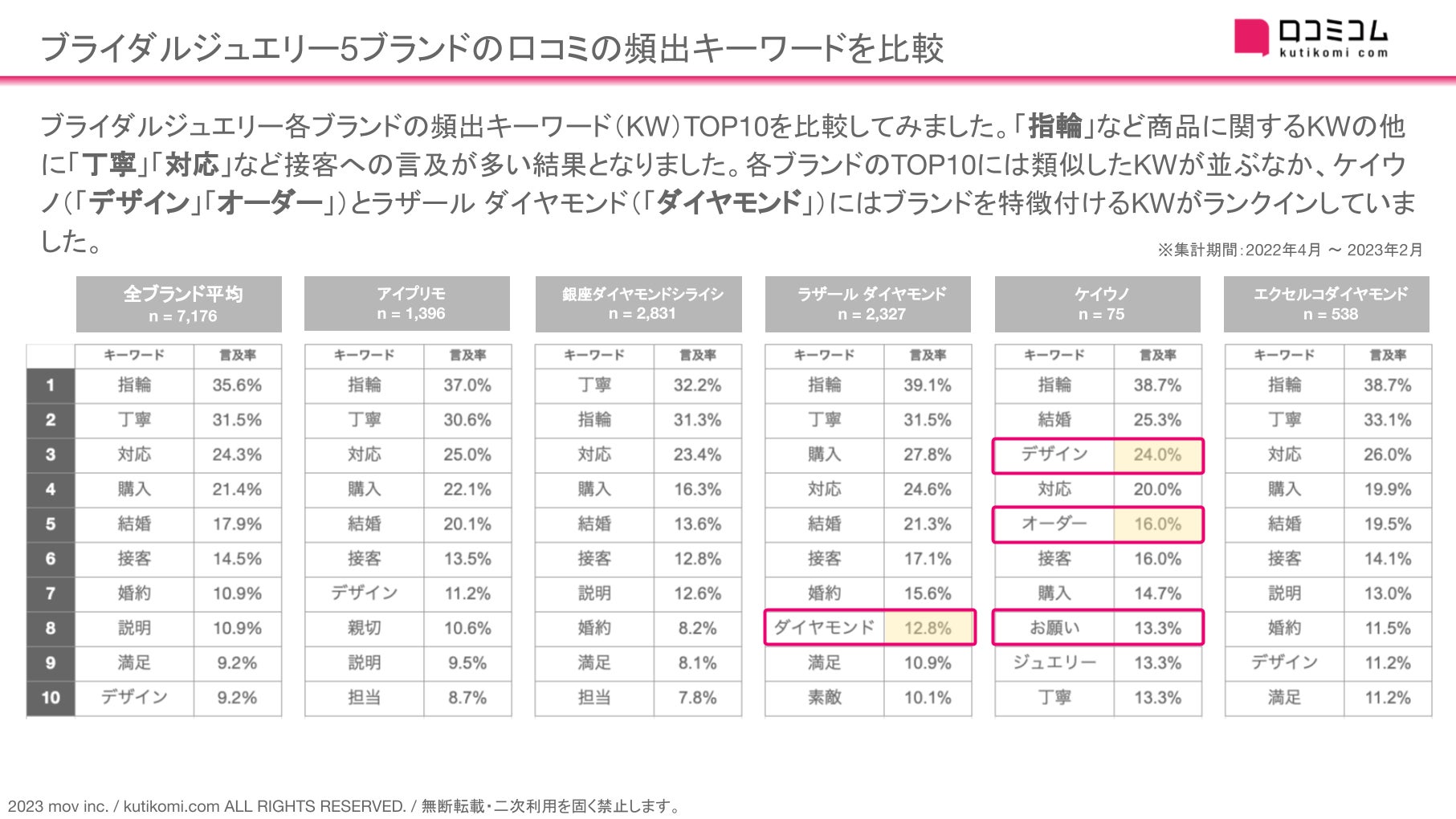ブライダルジュエリー各ブランドの頻出キーワードTOP10を比較してみました。「指輪」など商品に関するキーワードの他に「丁寧」「対応」など接客への言及が多い結果となりました。各ブランドのTOP10には類似したキーワードが並ぶなか、ケイウノ(「デザイン」「オーダー」)とラザール ダイヤモンド(「ダイヤモンド」)にはブランドを特徴付けるキーワードがランクインしていました。