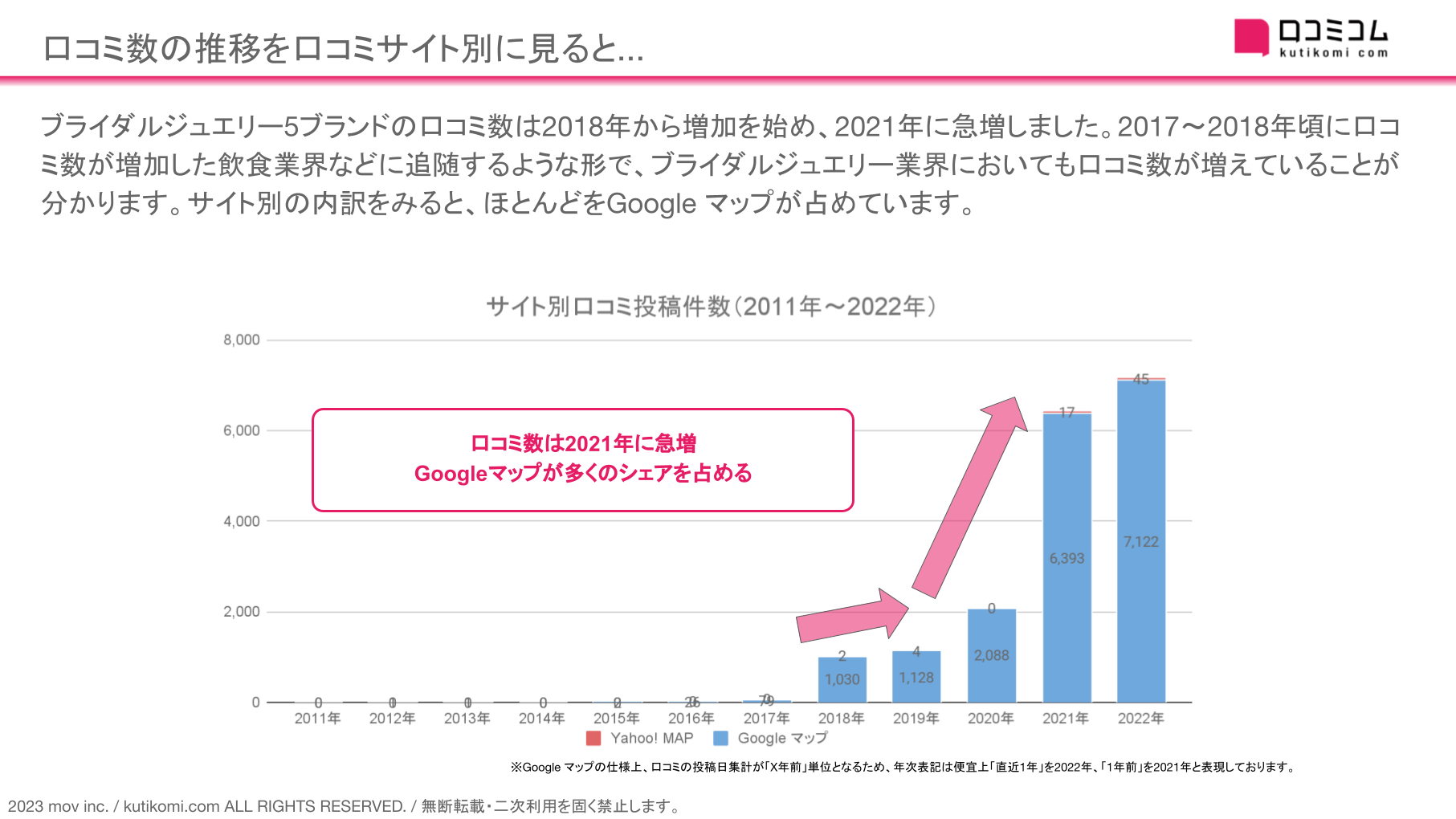 ブライダルジュエリー5ブランドの口コミ数は2018年から増加を始め、2021年に急増しました。2017〜2018年頃に口コミ数が増加した飲食業界などに追随するような形で、ブライダルジュエリー業界においても口コミ数が増えていることが分かります。サイト別の内訳をみると、ほとんどをGoogle マップが占めています。