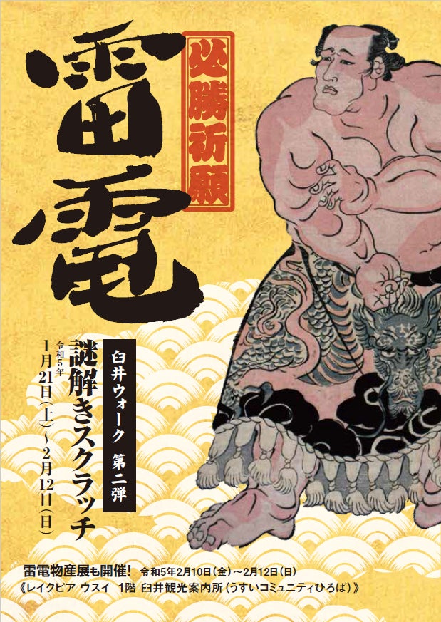 第1弾は、1月21日(土)から、雷電謎解きスクラッチがスタート。雷電終焉の地「臼井(うすい)」に設置された謎解きポイントを巡り、謎を解くと、必勝祈願グッズ(オリジナルクリアファイル)がもらえます。