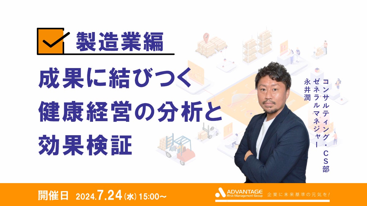 株式会社アドバンテッジリスクマネジメントは、2024年7月24日(水)に健康経営のご責任者およびご担当者を対象としたWebセミナー「≪製造業編≫成果に結びつく健康経営の分析と効果検証」を開催いたします。本セミナーでは、主に製造業にお勤めのご担当者を対象に、業界情勢や課題の“あるある”に触れながら、どうしたらもっと効率的に効果検証ができるのか、健康経営コンサルタントが分析の“勘所”を解説します。