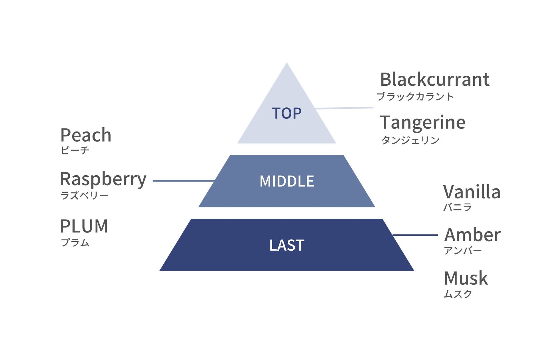 トップノートは、マンダリンオレンジ、ラズベリーやプラムなどフルーティーさが香り立ち、ラストノートはバニラ、アンバー、ムスクなどやさしい甘さが重なります。