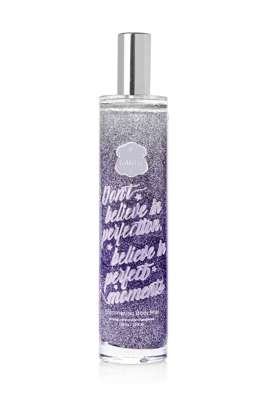 繊細に輝くシルバーグリッター入りのミストタイプのボディ用化粧水。
