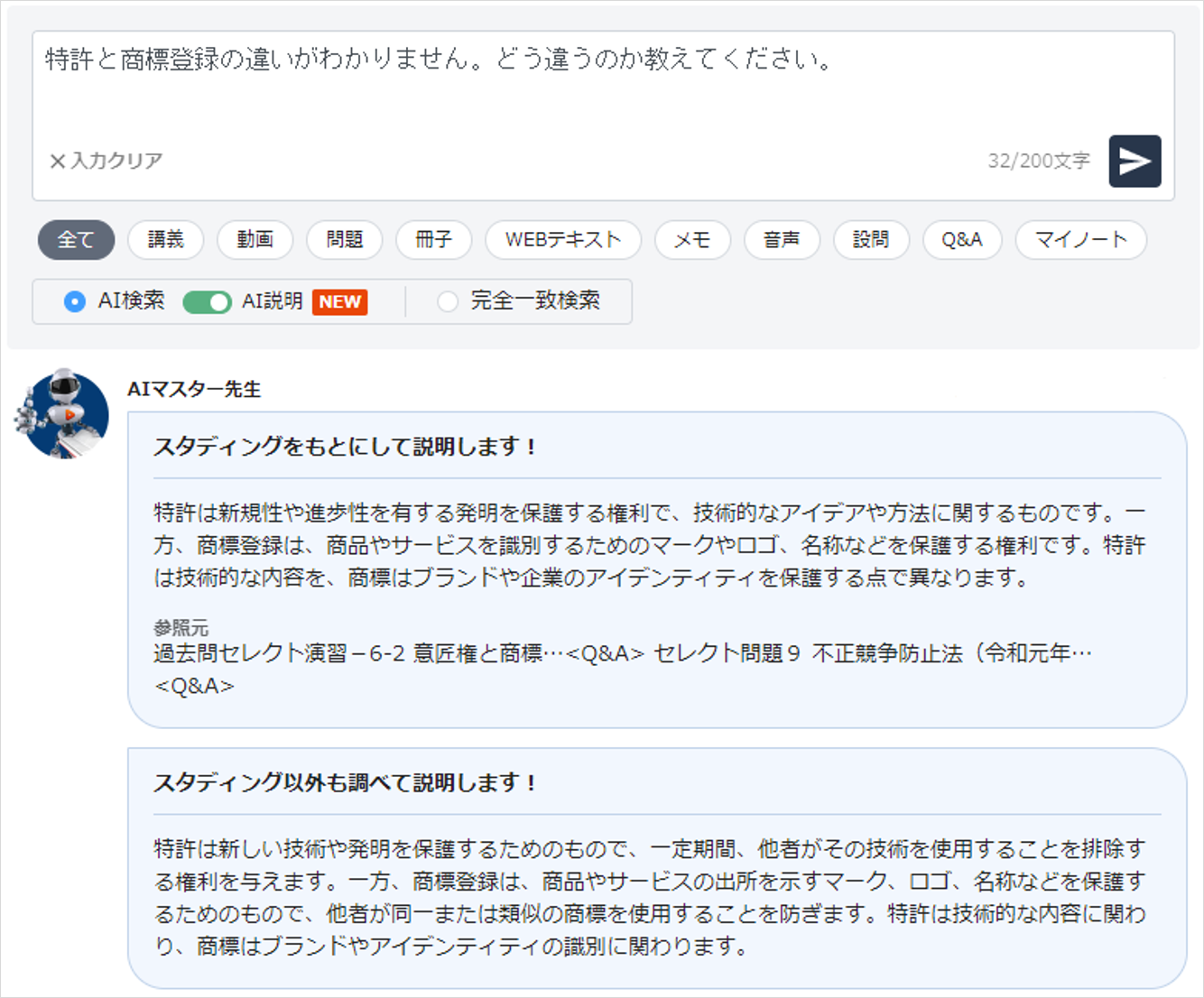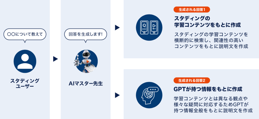 「AI説明機能」は、スタディングの学習コンテンツや質問・回答履歴、さらには生成AI(GPT-4 turbo)の知識を加えて、資格学習を進める受講者の疑問に「AIマスター先生」がその場で回答する機能です。
