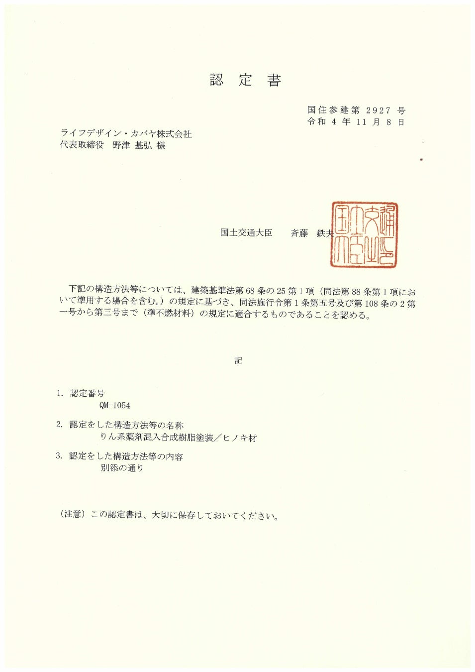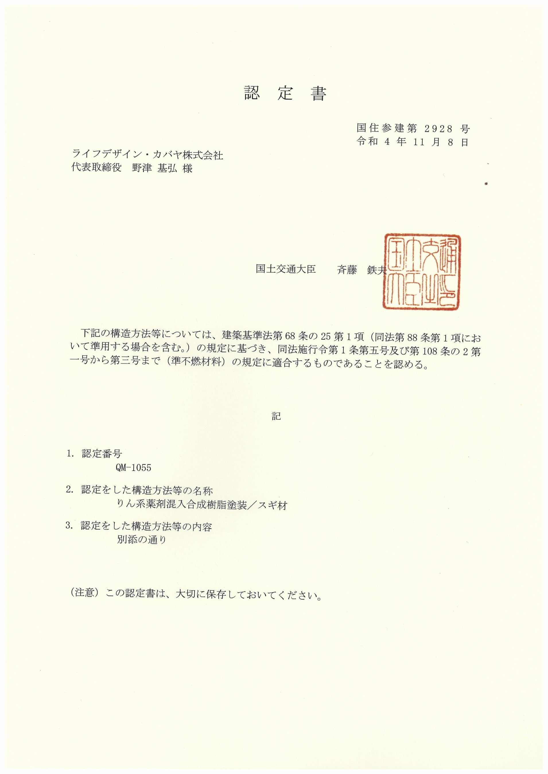 ライフデザイン・カバヤ株式会社(取締役社長:窪田健太郎/本社:岡山県岡山市)は、CLTに塗装する難燃塗料『なんねんCLTコート』の性能評価試験に合格し、2022年11月8日付で、国土交通大臣認定を取得いたしました。