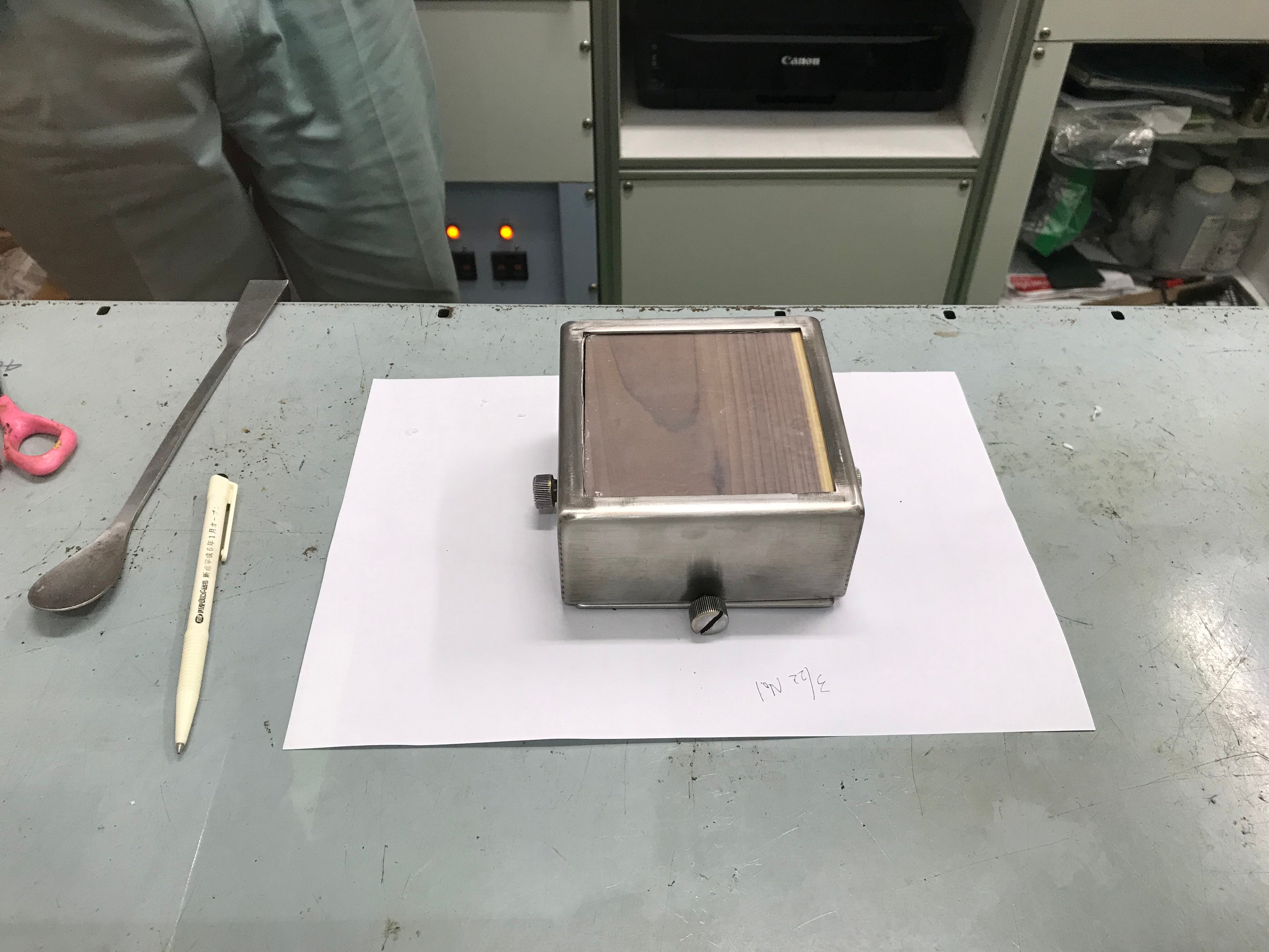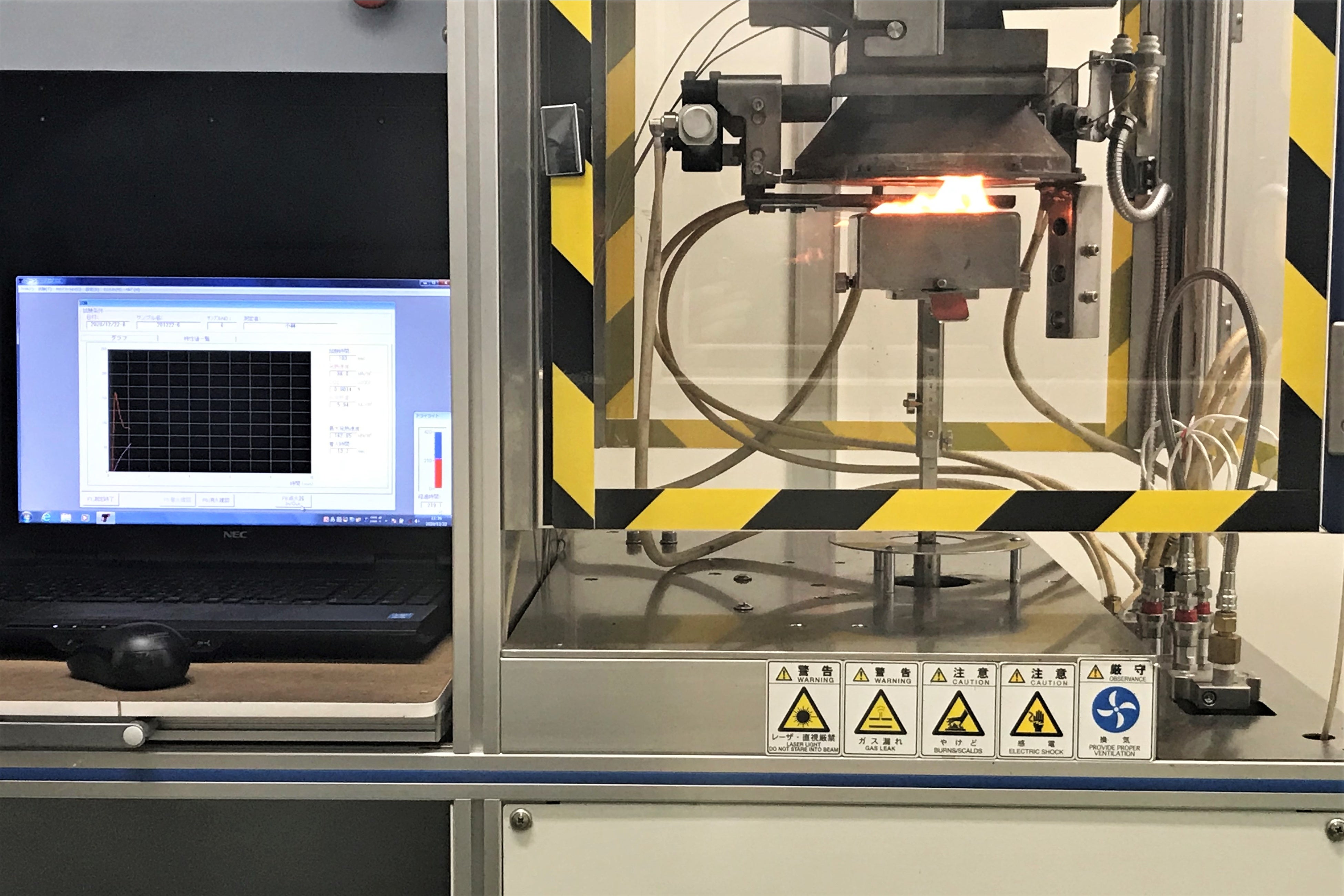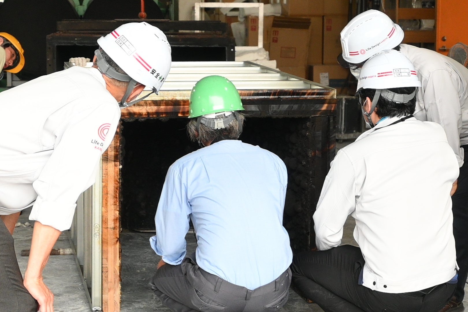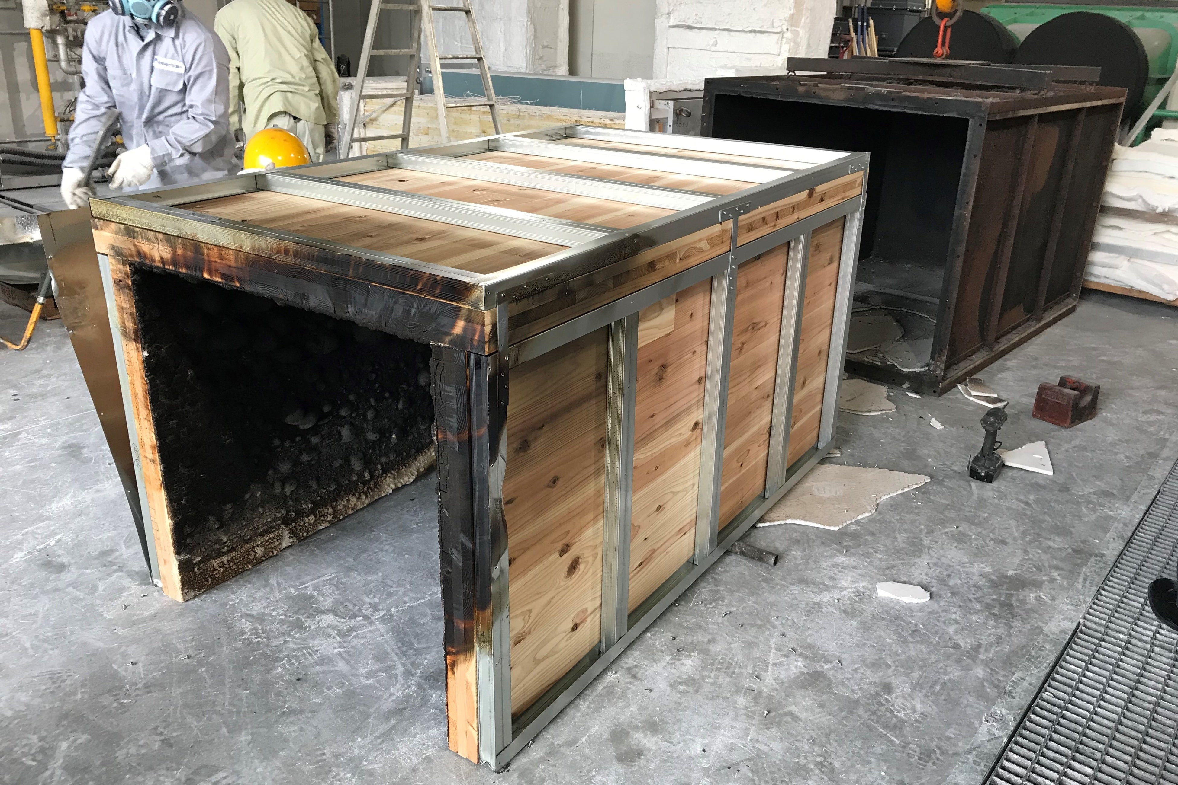 2020年12月、2021年1月、3月に計3回のコーンカロリーメータ燃焼試験により塗料の材料や性能に関する試験を行った後、(幅)約1,000㎜㎜×(高さ)約1,000㎜×(奥行)約1,800㎜の実寸大のCLTを実験体とした模型箱試験に切り替え、2021年6月、11月の計2回に渡り、予備試験を行いました。木は節や木目等があり不均一であるため、部分によって試験の評価が大きく左右されることを考慮し、あえて“実寸大”のCLTを実験体として、なんねんCLTコートの性能が実際に活用した際にも有効に発揮されるよう、安全性の確保を実現しました。