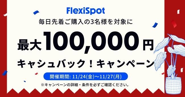 さらに初日11月24日(金)は0時より、11月25(土)~11月27日(月)の3日間は20時より、先着3名様(合計12名様)に最大10万円のキャッシュバックキャンペーンを実施いたします。1年に1回のお得なキャンペーンが詰まったFlexiSpotのブラックフライデーをお楽しみいただき、あなたにピッタリなFlexiSpotをお探しください。