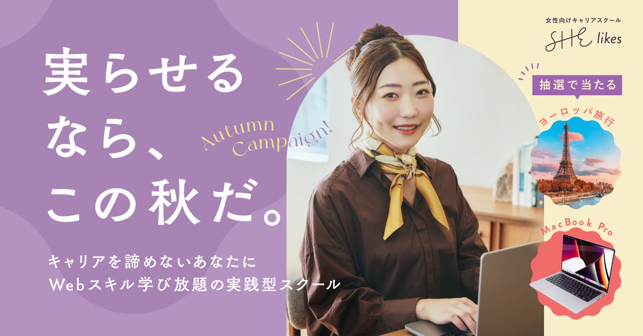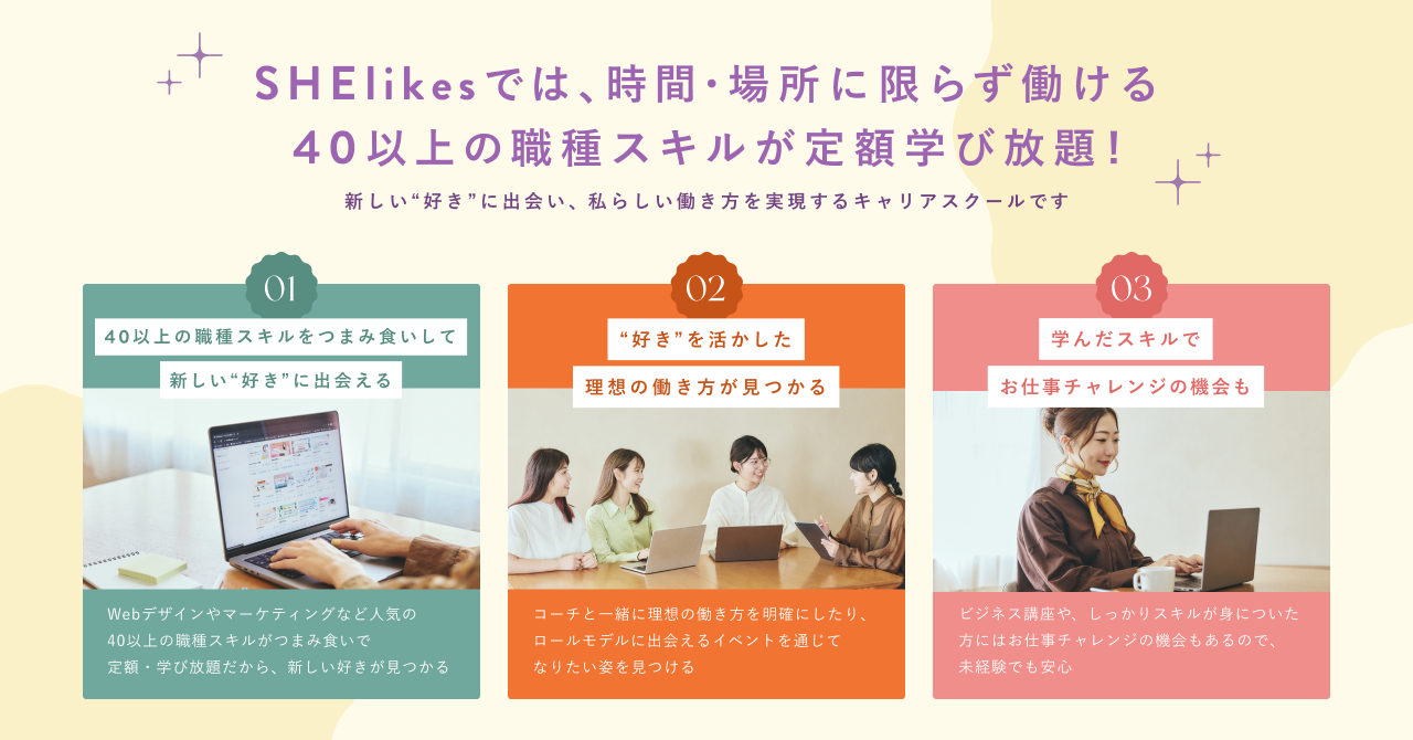 SHElikesは、時間や場所にとらわれずに働ける40以上の職種スキルが定額で学び放題の女性向けキャリアスクールです。Webデザイン・Webマーケティング・ライティングなどパソコン一つで働けるデジタルスキルやクリエイティブスキルを学ぶことで、私らしい働き方の実現を支援します。