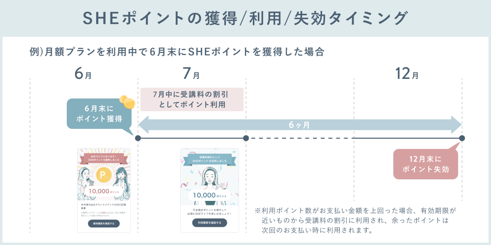 ポイントの有効期限は、獲得後6ヶ月間です(例:6月末に獲得した場合、有効期限は12月末まで)。有効期限内にポイントが使用されない場合は、自動的に失効します。
