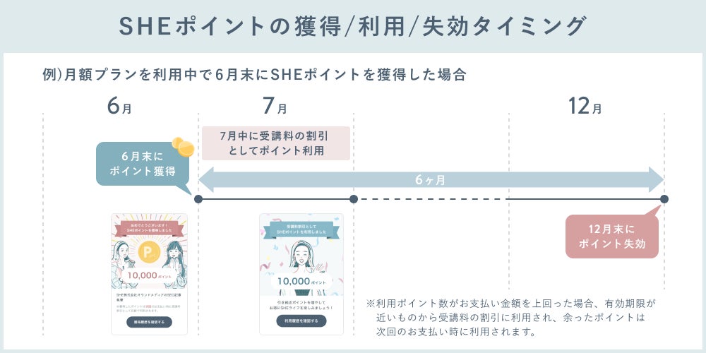 「SHEポイント」は、SHElikesのお仕事チャレンジやキャンペーンに参加することで獲得できるポイントです。1ポイント=1円分としてSHElikesの受講料割引にご利用いただけます。ポイントの獲得後、次回の支払い時に自動的に月の支払額から差し引かれます。