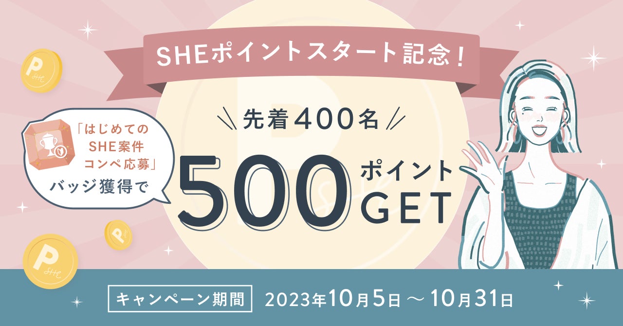 バッジ機能とSHEポイントのリリース記念として、SHEポイント&バッジ獲得キャンペーンを開催します。キャンペーン期間中にSHE公式SNSのクリエイティブなどの、SHE内のお仕事に挑戦して「はじめてのSHE案件コンペ応募」バッジを獲得した方の中から先着400名様に500ポイント=500円分をプレゼントします。