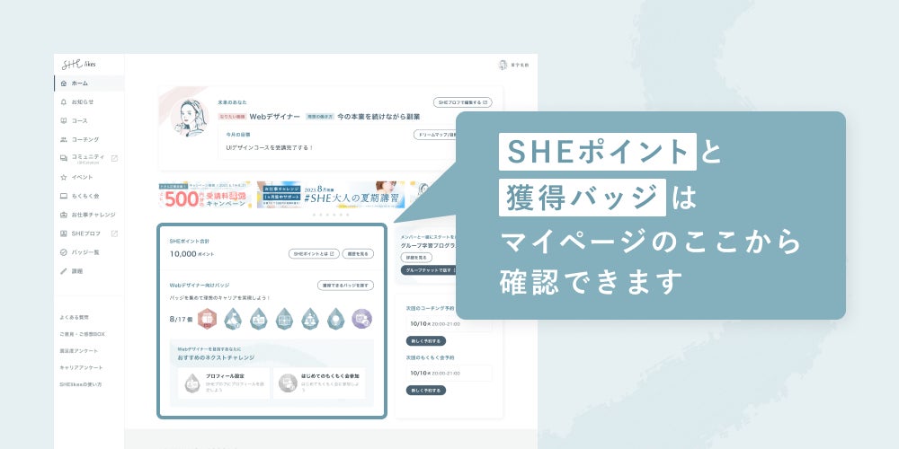 また、10月3日から受講料割引に使用できる「SHEポイント」もスタート「SHEポイント」機能もスタートしました。2つの新機能のリリースを記念して、バッジ獲得と連動してSHEポイントがもらえるキャンペーンを実施します。