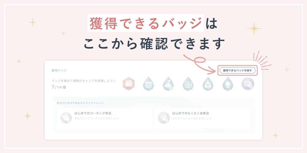 獲得バッジの右上「獲得できるバッジを探す」から「バッジ一覧」のページに進むことができます。